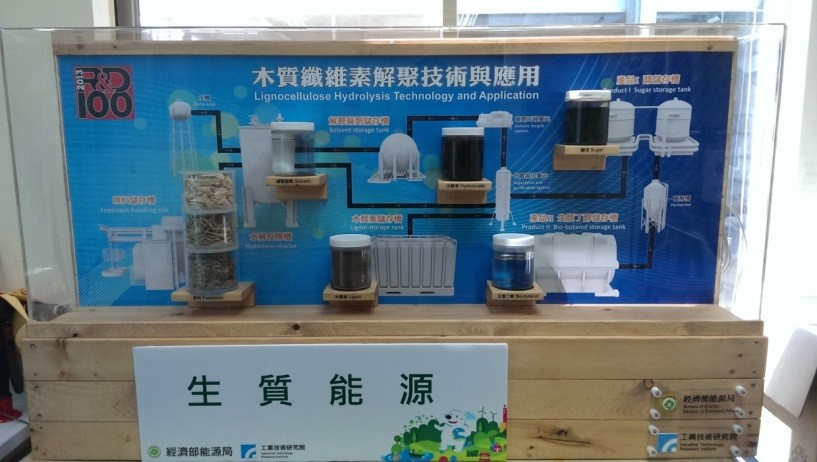 For the development of sustainable energy, depolymerization of lignocellulosic biomass technology is the key technology to convert biomass into liquid fuel and also corresponds to the principle of “never fighting over food against our citizens”. ITRI’s research group has developed the innovative ionic solution hydrolysis technology, which converts varied lignocellulosic feedstock into sugars under the mild condition. The quality and price of cellulosic sugar are not only able to compete with molasses and but also further supply to the downstream applications. This cellulosic sugar can be further converted into biofuels such as bioethanol and biobutanol via different processes. It also can be applied to any other sugar derivatives chemical industries such as monomers of polymers.