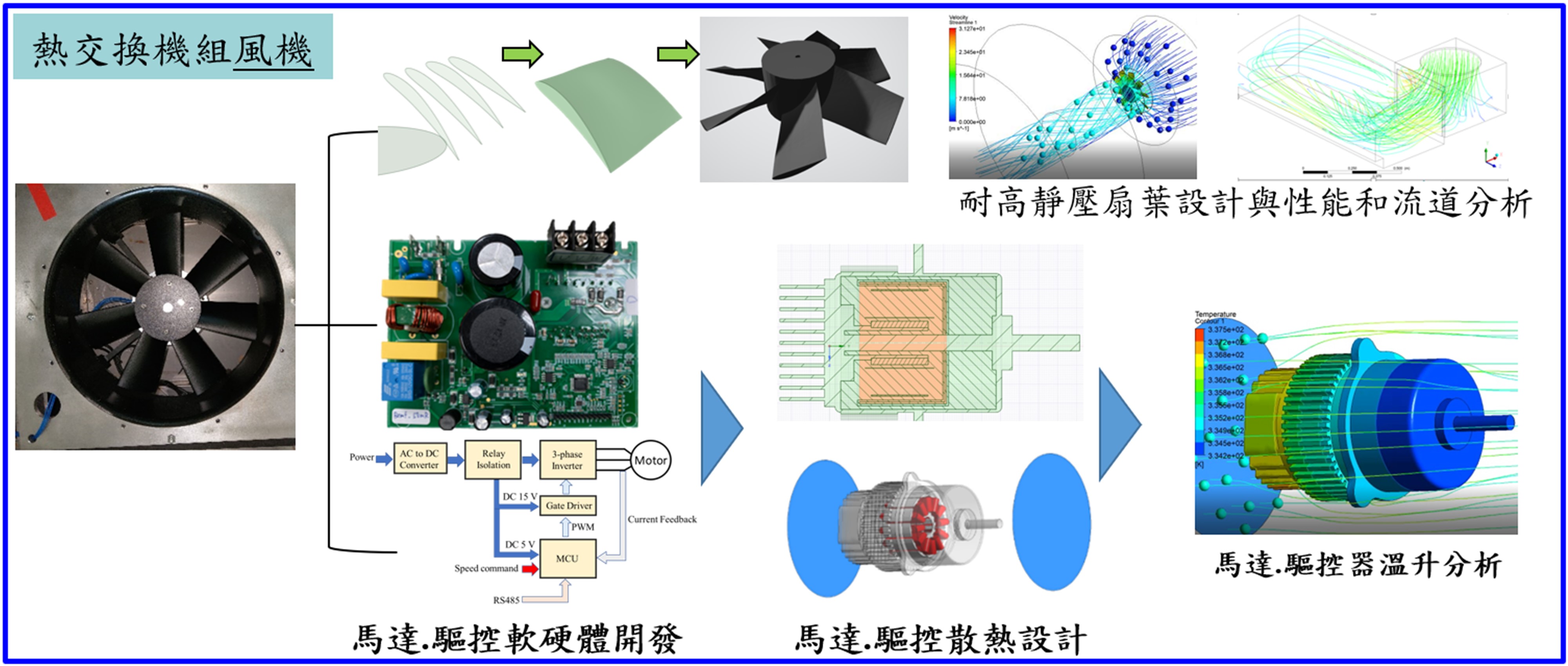 (2) The geometry of NACA fan (ITRI) optimization + wind field optimization of condenser fan units + fan blade design and matching motor/drive control for high efficiency.