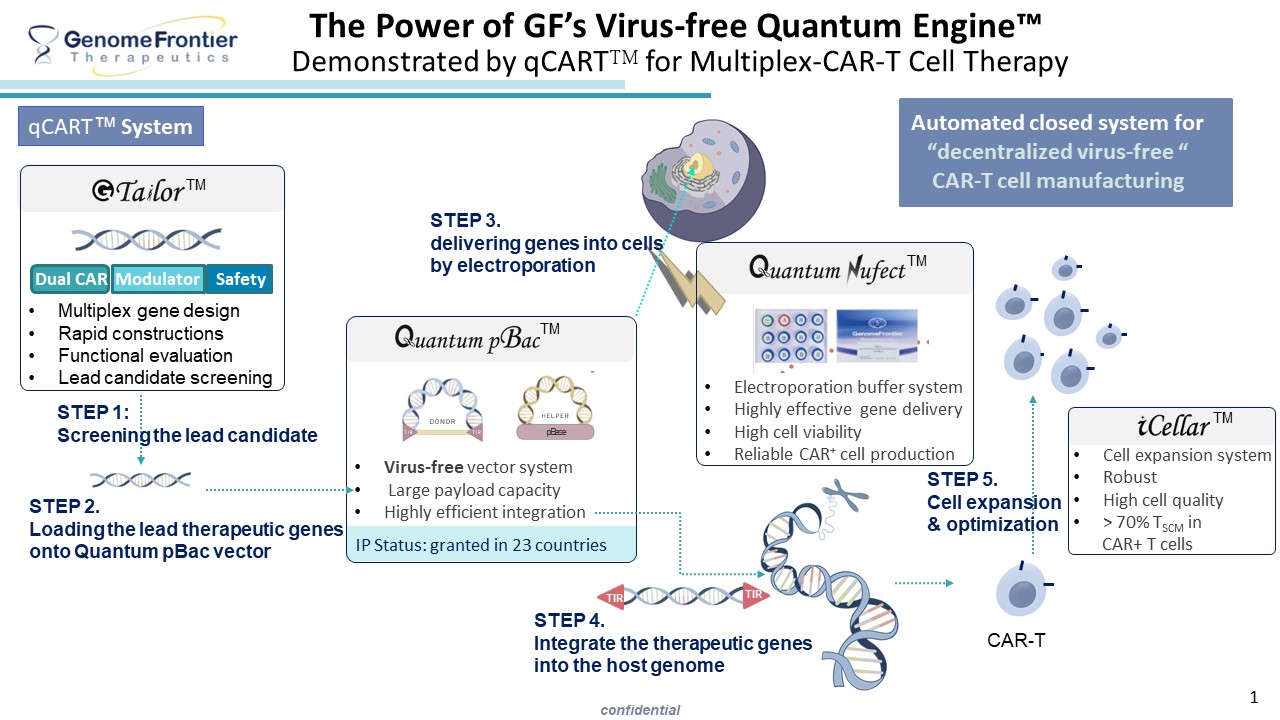 • GenomeFrontier Therapeutics, Inc. (GF) addresses these unmet needs of conventional gene therapy by integrating four platforms: Quantum Nufect™, Quantum pBac™, iCellar™ and G-Tailor™, which improve vector delivery, therapeutic gene integration, cell expansion capacity and gene design, respectively. Synergistically, these platforms form the Quantum Engine™ for producing virus-free, gene-modified cells optimal for immune therapy.