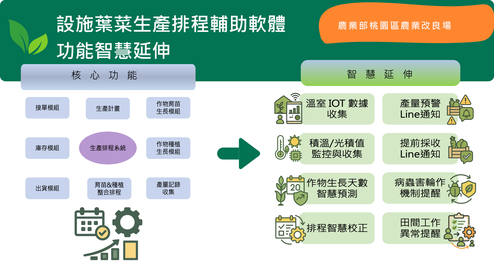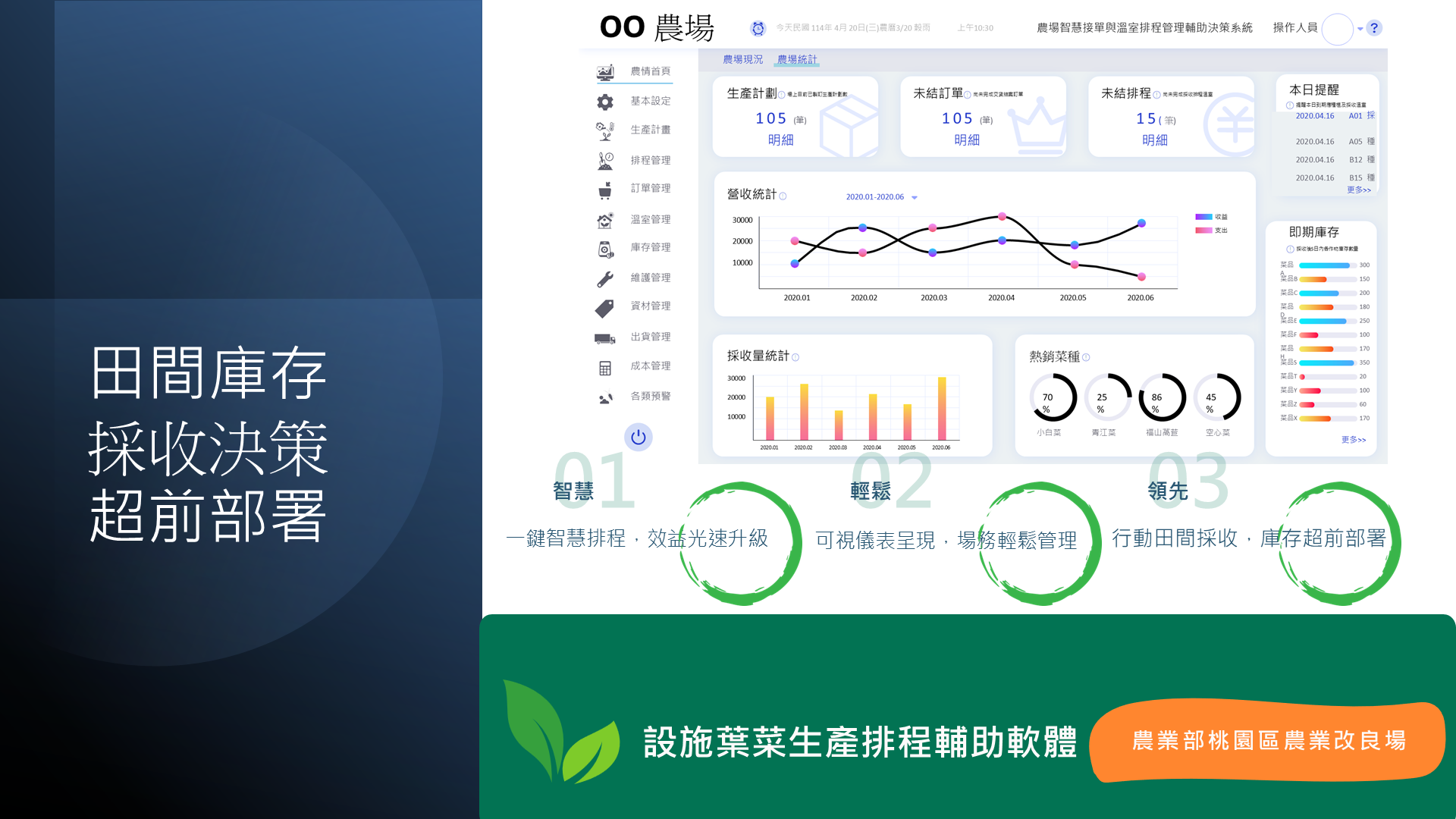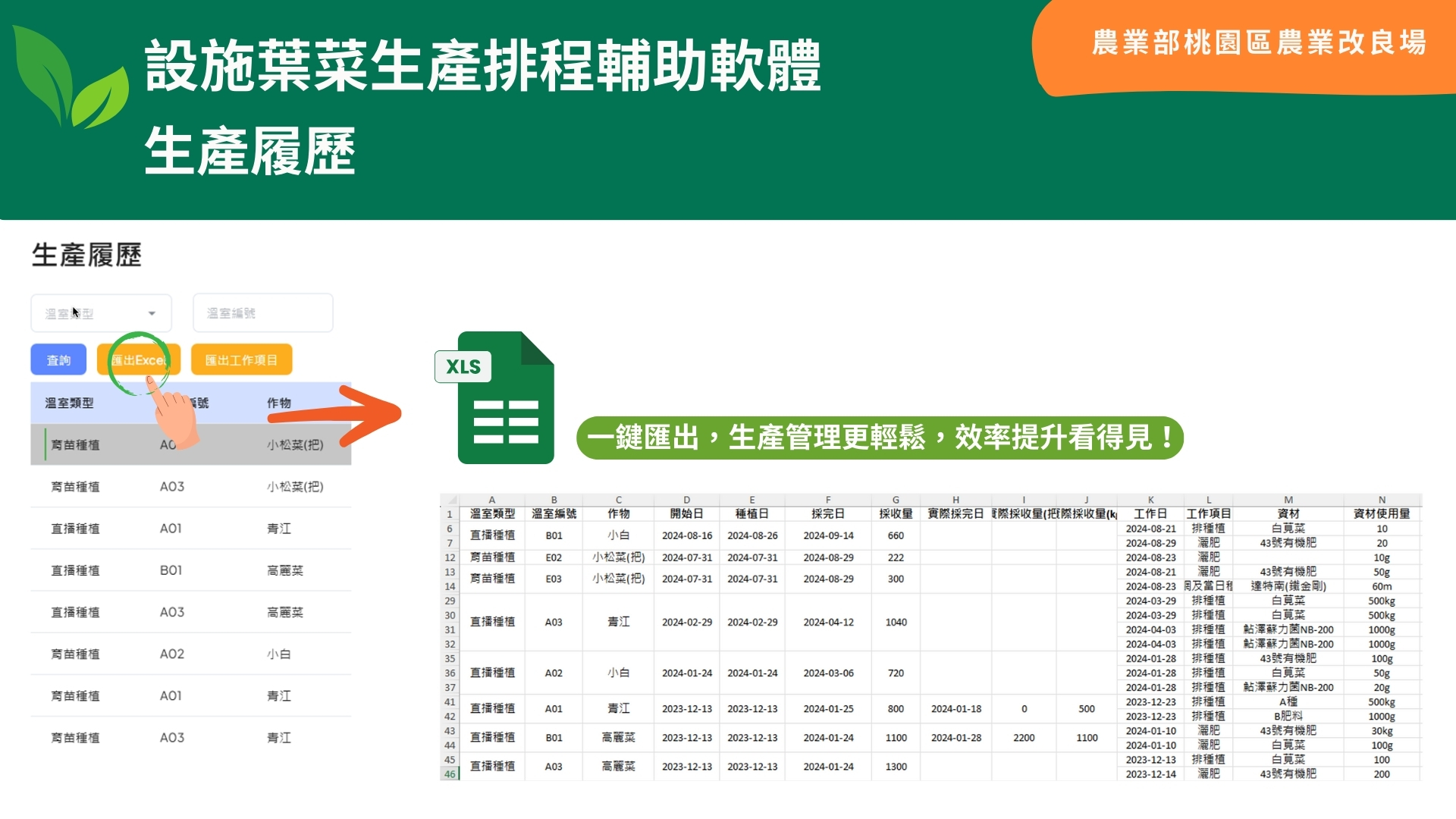 In medium- to large-scale protected vegetable farms, production is often 1.5–2 times the required quantity to ensure delivery schedules, which can lead to overproduction and increased costs. This system leverages data on yield, delivery schedules, cultivation records, and greenhouse space management to provide digital production scheduling and intelligent order management support. Through data analysis and automated forms, it enables accurate yield forecasting, daily production capacity updates, and optimized resource allocation, thereby reducing waste and improving production efficiency.