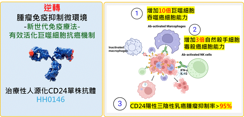 Triple-negative breast cancer lacks effective targeted therapies, posing a significant clinical challenge and unmet medical need. HH0146, a first-in-class humanized CD24 mAb developed in Taiwan, holds a Taiwan invention patent and has completed PCT filing. It specifically activates macrophages, promoting cancer cell phagocytosis and reshaping the tumor immune microenvironment. As a novel immune checkpoint inhibitor, HH0146 demonstrates exceptional anti-tumor efficacy.