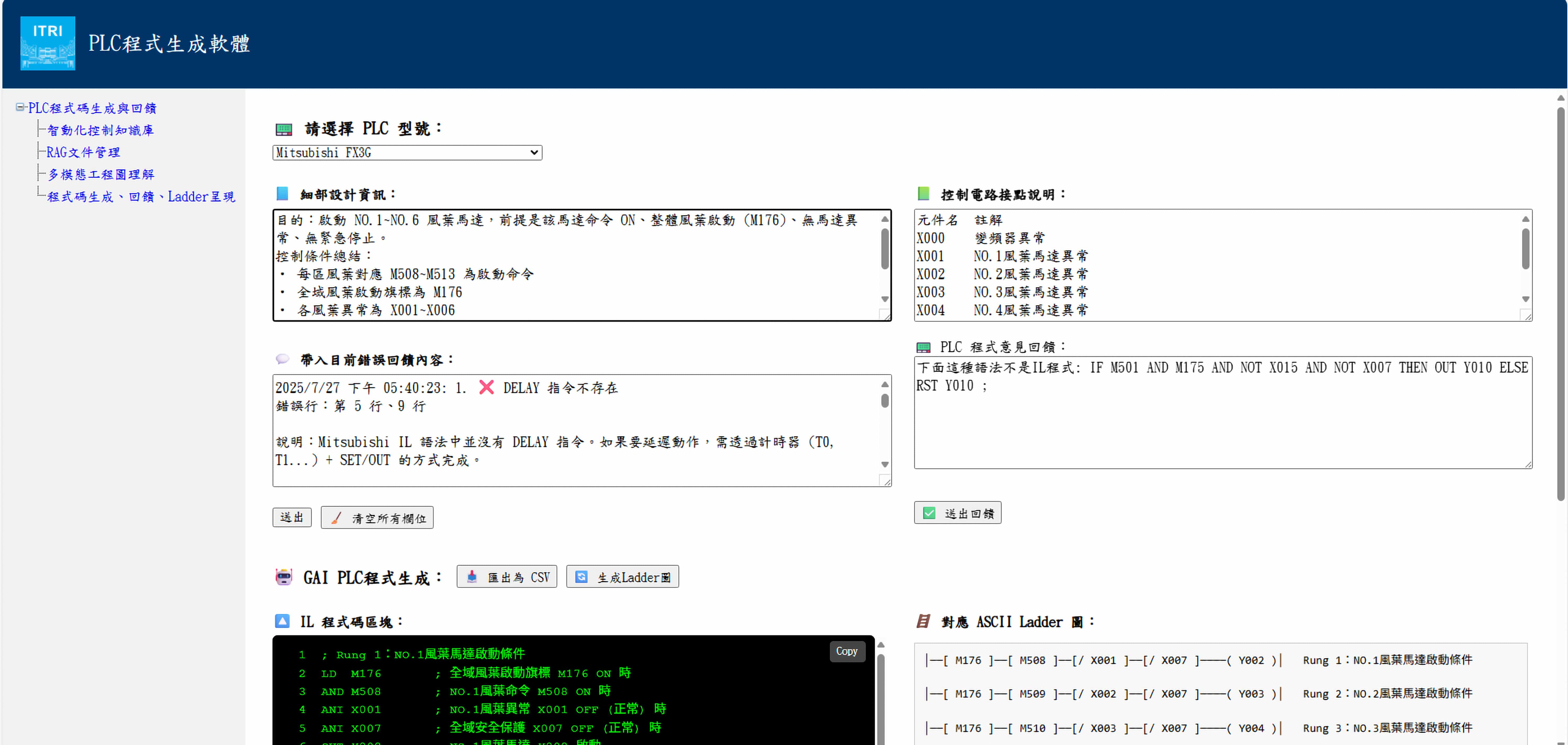 The GAI PLC Program Generation Software leverages Multi-Style Prompting to strengthen Retrieval-Augmented Generation (RAG) in domain-specific knowledge applications. By employing in-context learning, it integrates engineer feedback seamlessly into subsequent prompt iterations, ensuring the generation of comprehensive and highly accurate PLC control programs, encompassing both control logic design and I/O point configuration.
