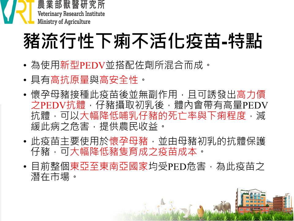 Sustainability | AgricultureThe inactivated vaccine for porcine epidemic diarrhea (PED) is formulated with a novel PEDV strain and an adjuvant, offering both high antigen content and superior safety. When administered to pregnant sows, the vaccine induces high anti-PEDV antibodies with no adverse effects. Nursing piglets with suckling colostrum acquire high levels of anti-PEDV antibodies that significantly reduce mortality and severity of diarrhea. Given that PED remains widespread across East and Southeast Asia, these areas are considered promising markets for this vaccine.