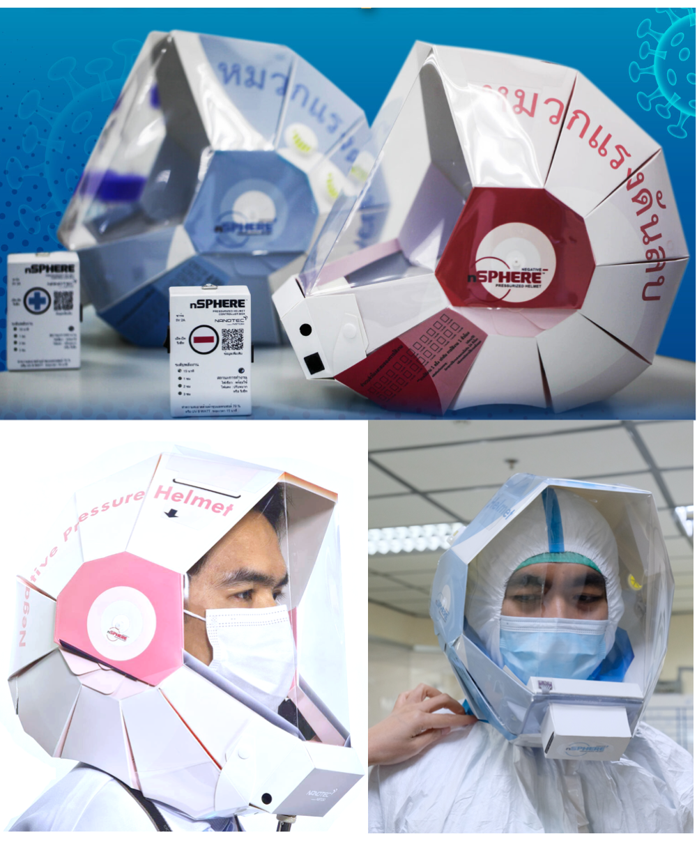 nSPHERE pressurized helmet is a personal protective equipment to guard user from harmful airborne contaminated droplets. Pressure difference between inside the helmet and surrounding is exploited to create two protection categories. Positive pressure (> 5 Pa) is exploited to shield the user from dust/particles outside the helmet, match for medical staffs who are in contact with patient. Conversely, negative pressure (< -4 Pa) is used to contain contaminated droplets within the helmet, suitable for patients who have potential risk of spreading pathogens. Safety issues have been addressed by integrating pressure sensors for real-time pressure difference monitoring with LED indicating working status of the helmet. The contaminated air is purified by a filtration unit (efficiency of 99.97% @ 0.3 µm DOP, protection factor higher than N95 mask).