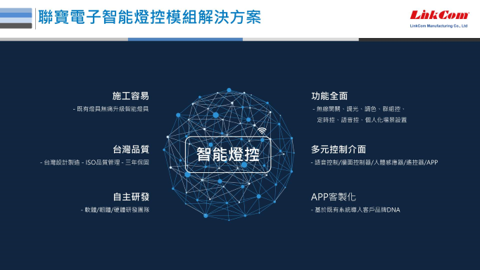 搭載此藍牙網狀模組的LED燈具不僅可支援LED燈單色,雙色溫,RGB全彩控制,還可使用聯寶電子免費提供的APP(Incore2)來實現無線燈控.同時亦可搭配聯寶電子的全系列藍芽燈控配件如離線智能語音助理、牆壁開關、無線遙控器、PIR sensor等配件來建立完整而彈性的智慧居家/商用照明燈控方案。