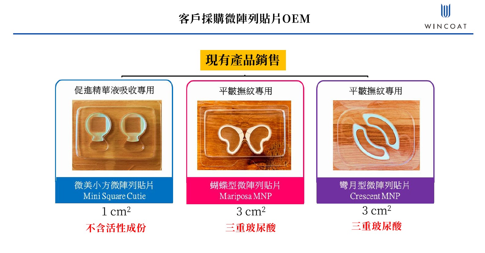 化妝品 MNP 由透明質酸和其他活性成分組成。 WCC 開發了多種化妝品,包括抗皺和淡化黑眼圈 MNP。 WCC建立了合於化妝品GMP和ISO 22716批量生產線,第一項產品已於2020年5月上市。 WCC還與寶齡富錦公司合作(台灣股票市場,代碼1760)於2020年第四季技轉一條生產線,MNP生產能力可達10,000件/天。 WCC有不少ODM客戶,開發獨特的微針貼片美容產品,從研發到量產一併完成。WCC亦有多種功能OEM產品供客戶銷售。