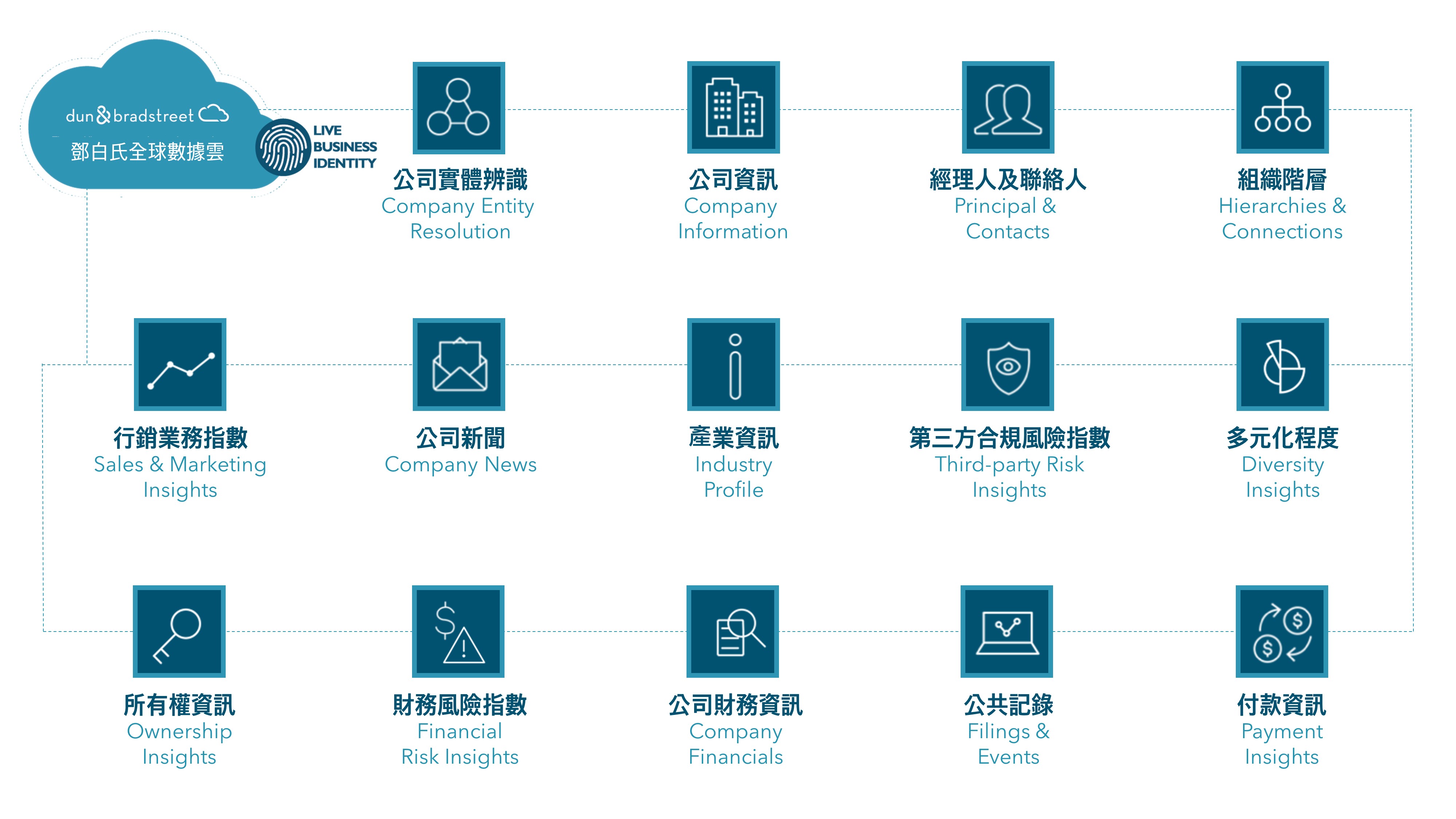 從鄧白氏數據雲內擷取數據與洞察,提供全球超過四億家企業的全面數據與分析資料,包括基本資料、財務資訊、企業家族關聯、政府與產業 法遵狀態以及多元分類。