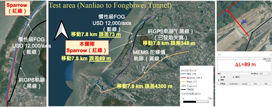 於110年4月在鳳鼻尾隧道進行測試,MEMS定位誤差達到4300公尺,由於無GNSS訊號,導致GNSS 偏移348公尺,本團隊模組跟國際FOG達到類似精確度,移動7.8公里,誤差為89公尺與73公尺,誤差分別為MEMS (55%)、GNSS(4.5%)、本團隊模組(1.1%)國際FOG(0.9%)。