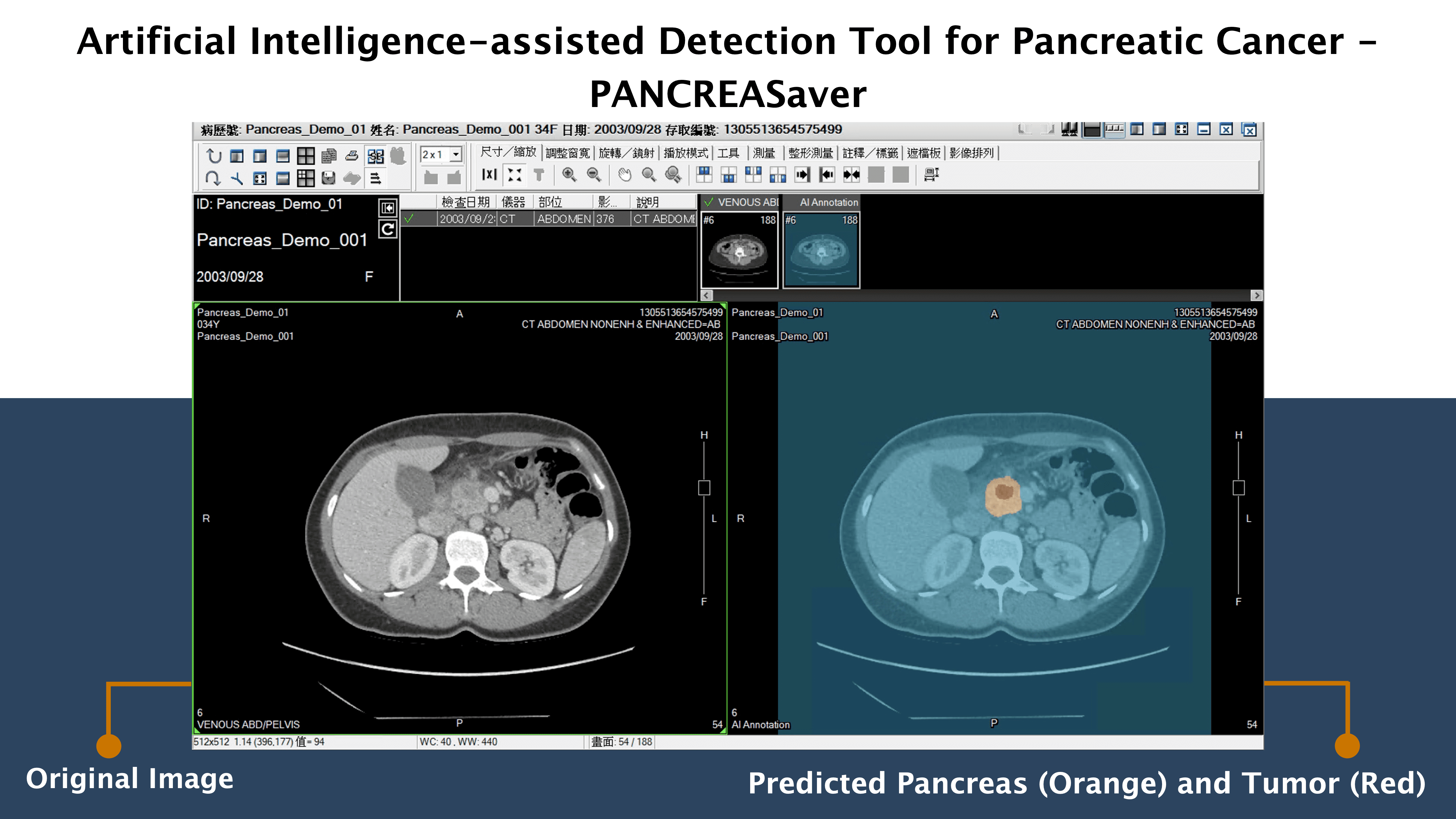 人工智慧胰臟癌輔助偵測系統 PANCREASaver 是全球首創能在 CT 影像上偵測胰臟癌之電腦輔助偵測系統 (computer-aided detection system),目前在國內外尚無其他類似產品。此自動化電腦輔助偵測系統能,不只能以人工智慧模型分析腹部 CT 影像上是否有胰臟癌,且能並列顯示原始影像及人工智慧模型預測之胰臟與腫瘤區域,供醫師判讀 CT 影像時參考。PANCREASaver 透過深度學習 (deep learning) 技術,使用 CT 影像資料訓練開發出「胰臟及胰臟癌自動輪廓勾勒模型」(深度學習影像分割)與「人工智慧胰臟分析模型」(深度學習分類)。PANCREASaver 能直接讀取經注射顯影劑顯影的CT影像,並利用影像處理演算法做自動化初步前處理,不需人工對影像進行標示或前置處理,即可利用人工智慧判斷影像中是否有胰臟癌,並指出胰臟癌所在的區域。