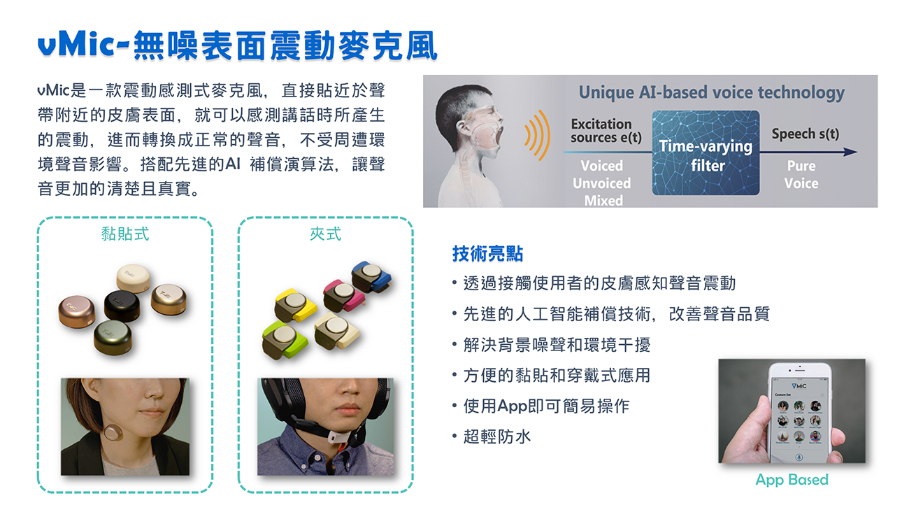 vMic 是一種新穎的無噪表面震動麥克風,直接貼近於聲帶附近的皮膚表面,就可以感測講話時所產生的震動。借助我們先進的AI 補償演算法,可以分析並還原您的聲音,進一步讓聲音更加的清楚且真實。透過黏貼式以及夾式兩種機構外觀設計,可以讓 vMic 輕鬆地貼在人的皮膚上或夾在衣服或帽子上。與其他商用麥克風相比,vMic更易於攜帶,使用起來非常便利,語音質量有保證。在工廠等吵雜的環境中,傳統的麥克風會受到環境背景噪聲的干擾,因此不適合通信。此外,傳統的麥克風亦不適合從事騎自行車、騎摩托車和滑雪等戶外運動的使用者。在這種不理想的環境和條件下,vMic 是您的最佳選擇。無論環境多麼嘈雜,vMic 都能提供清晰的聲音。