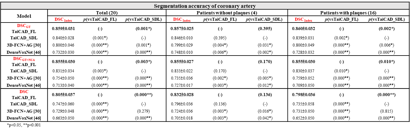 本模型之冠狀動脈分割準確度為86%(以Dice similarity coefficient, DSC評估),重組血管豐富度方面多找出159 mm冠狀動脈(8.2條分支)。在個別斑塊分割上,斑塊段落分割準確度DSC為82%。由於本模型具遠高於相似模型之準確度,極具競爭力(甫獲MICCAI 2020冠狀動脈自動分割ASOCA準確度競賽全球第三名)。本方案目前已申請三項專利,亦準備申請TFDA認證。