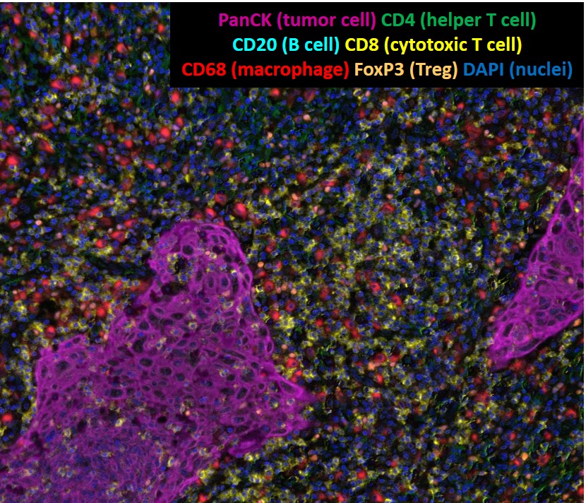 利用多色免疫組織染色法揭露腫瘤免疫微環境中各種免疫細胞資訊。玻片上各種免疫細胞被螢光探針標定後,將其密度、相對位置等資訊進一步分析。