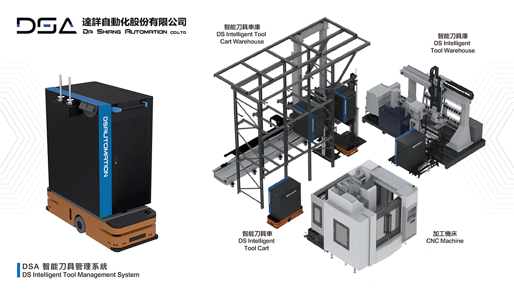 「DSA 智能刀具管理系統」整合了「刀具管理系統」、「DS 智能刀具車」、「智能刀具庫」三要素。藉此滿足客戶刀具管理所需考量的刀具資訊管理、刀具配送、刀具與物料的倉儲管理。