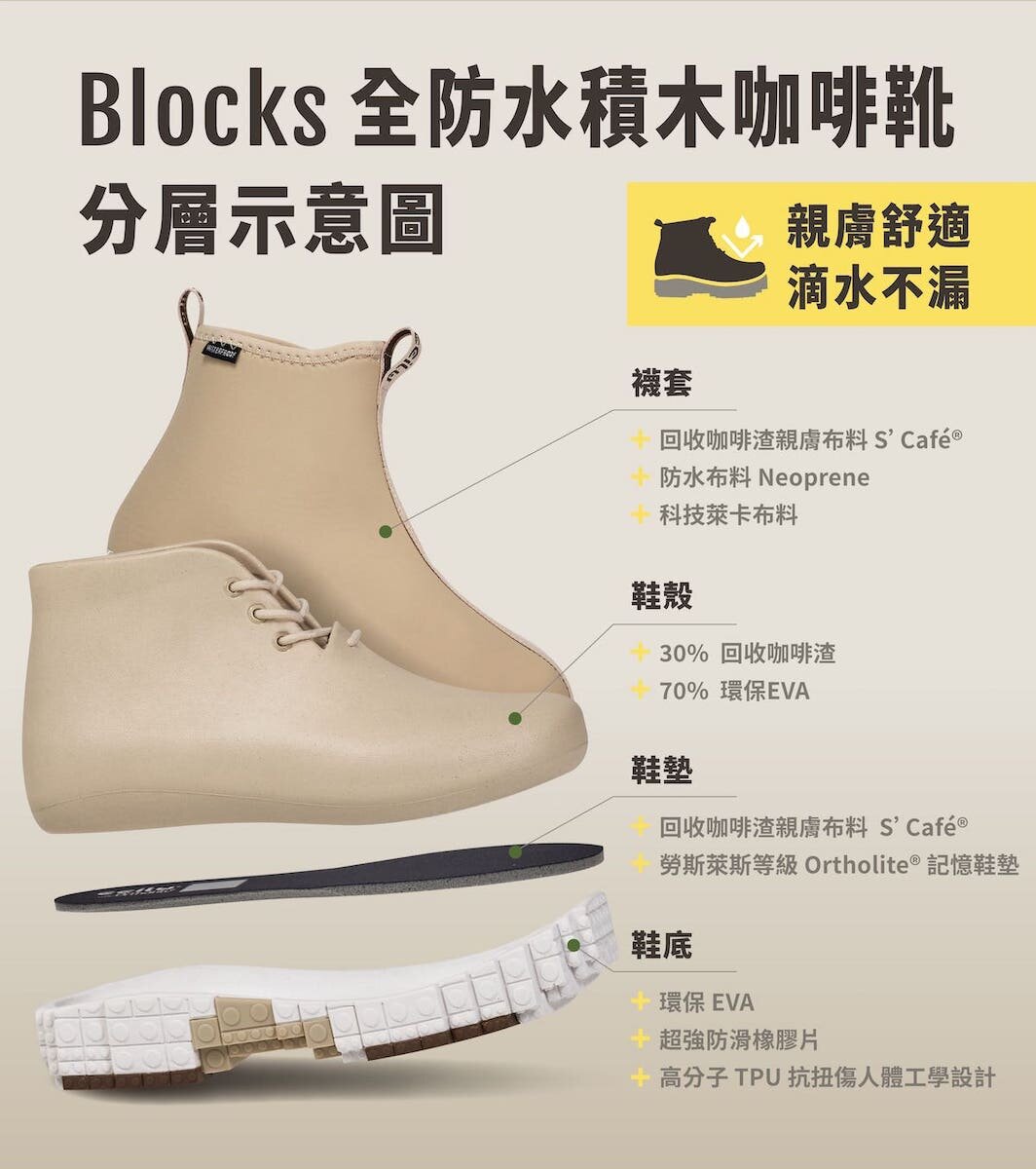 XpreSole® Blocks 全防水積木咖啡靴由 15 杯回收咖啡渣製成,集防水、超輕量、吸濕快乾、抓地力強、可機洗等 12 項機能,是一款適合各種場合(城市、鄉村、散步、雨天)的靴子,加上獨家設計的積木鞋底,不僅提供雙腳堅固的支撐,更帶你找回童心,穿出風格!