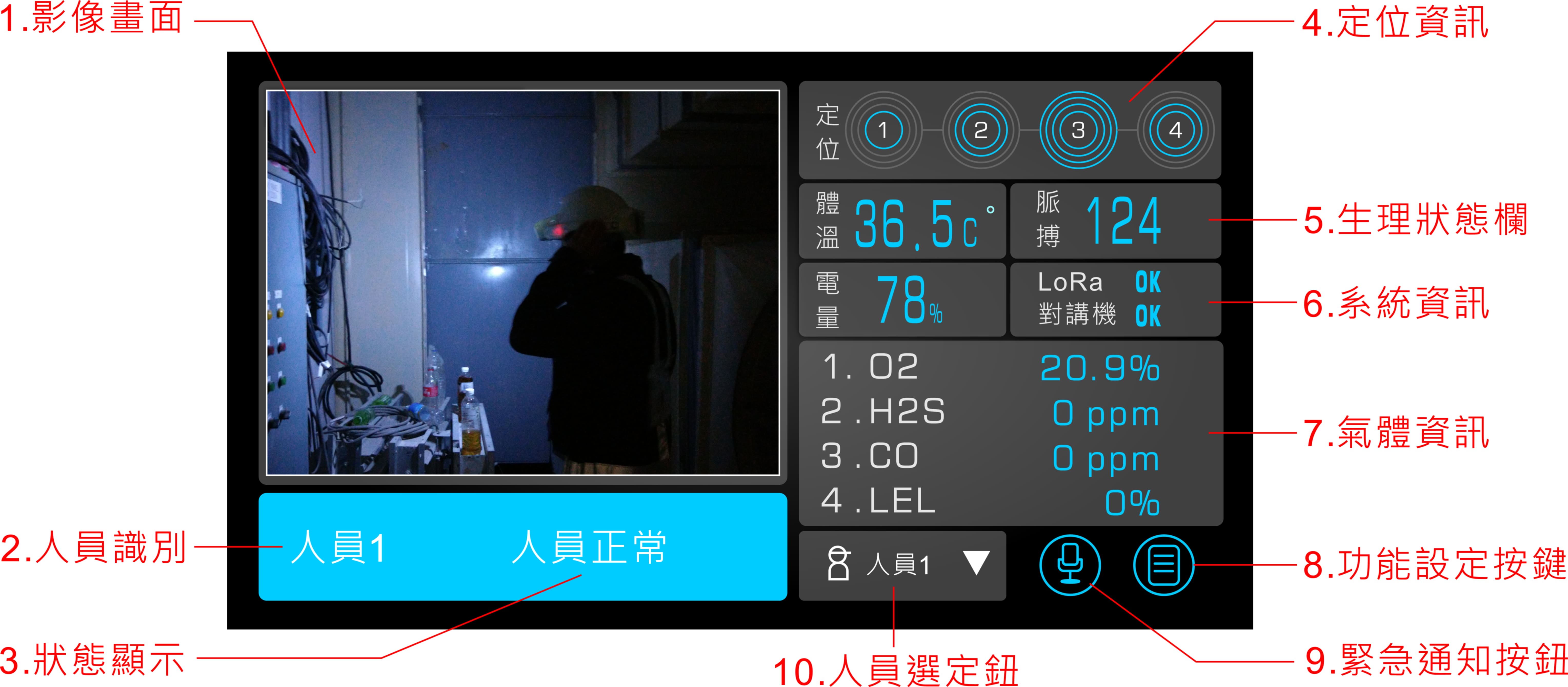 本智慧安全帽可將現場作業環境及勞工活動的資料,回傳至後端監控者,使管理人員能隨時掌握現場人員的生理狀況及作業環境條件等信息,於緊急時得以適時作出適當之處置,保護人員安全。