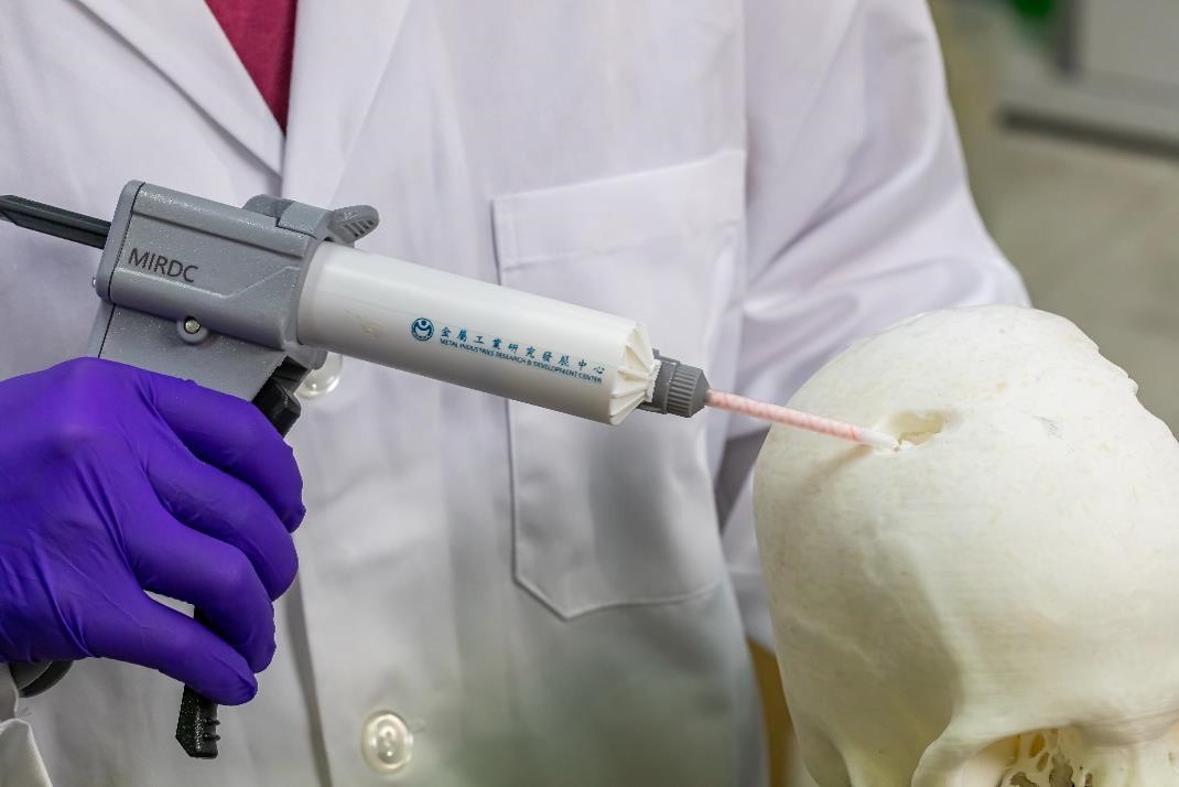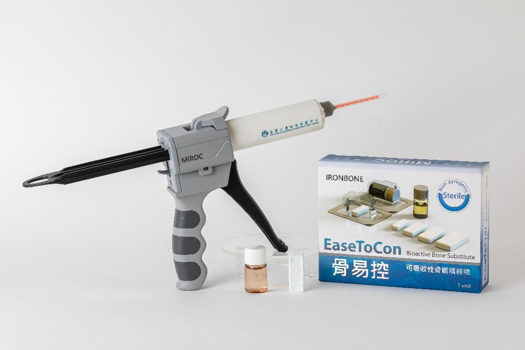 膠原蛋白/生醫陶瓷複合支架高度可塑能力提供醫師操作便利性; 次微米技術促進細胞胞吞作用,活化骨礦化機制路徑; 離子誘導技術誘導血管細胞生長,提升血管生成。結合三項技術,有效提升新骨生成效果。骨填補物用注射器的螺旋混合設計簡化手術流程,縮短50%以上操作時間。