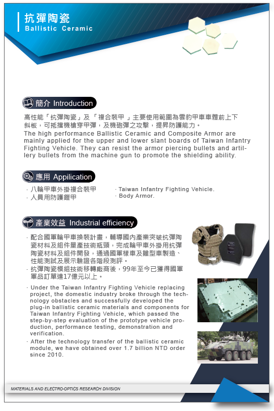 高防護性複合裝甲(抗彈鋼板及抗彈陶瓷)為我國防自主防護產品,各國技術視為機密且無法由國際籌獲,其在輕量化同時亦維持防護力,可同世界先進甲車正面抗大口徑機砲同等威脅,另提供不同威脅彈種客製化抗彈需求,達成最佳防護效益。