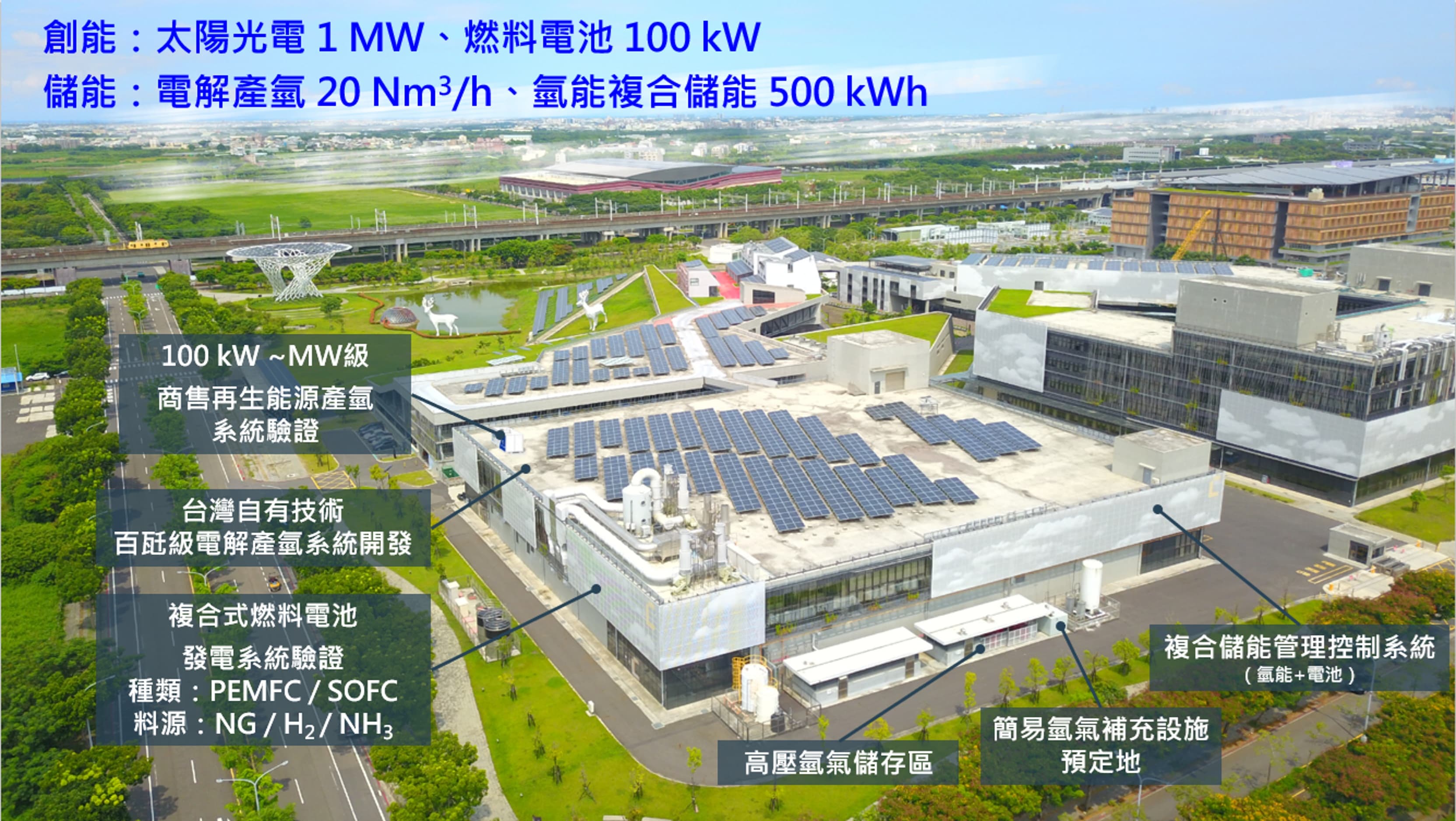 工研院透過科研整合建構氫能產業發展平台,於沙崙智慧科學城建立首座氫能生產、輸儲及應用示範驗證場域。整合MW級再生能源電力、百瓩級電解產氫系統、複合式氫能/電池儲能、分散式發電與燃燒熱應用,以及氫料源回收純化應用等技術,完整呈現氫能生產、運輸、儲存、利用之示範驗證園區,協助產業擘畫淨零排放之氫能技術路徑與發展藍圖。