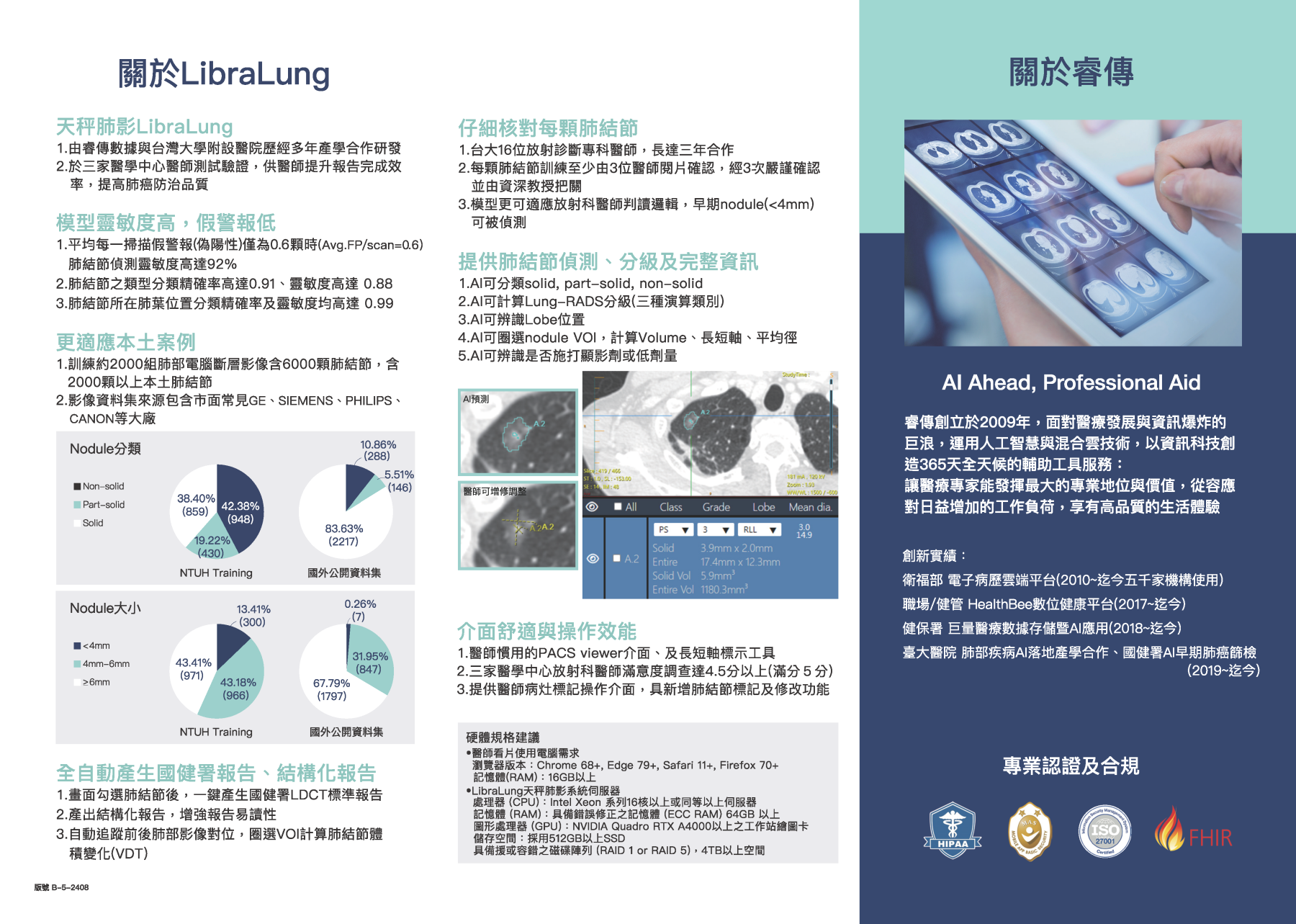 LibraLung為因應國健署大規模肺癌篩檢的龐大需求而生。由睿傳數據與臺大醫院共同開發,並獲TFDA醫材許可及國健署官網獨家推薦。