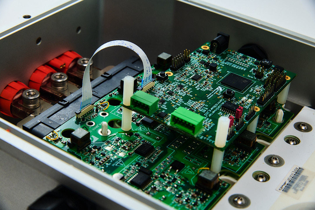 基於國產自主 1.7kV 低導通電阻碳化矽功率元件及低熱阻功率模組封裝等前瞻技術,工研院電光所開發 800V/250kW 高效率碳化矽元件模組驗證平台,電源迴路的雜散電感低於12nH,最高效率達99.14%,大於98%效率地圖占比達67.16%,最大輸出功率達216kW,可驗證項目包含功率元件、功率模組、驅動IC及微處理器IC等關鍵組件,大幅縮短廠商系統驗證時程,有效帶動國內廠商切入車用電子市場。