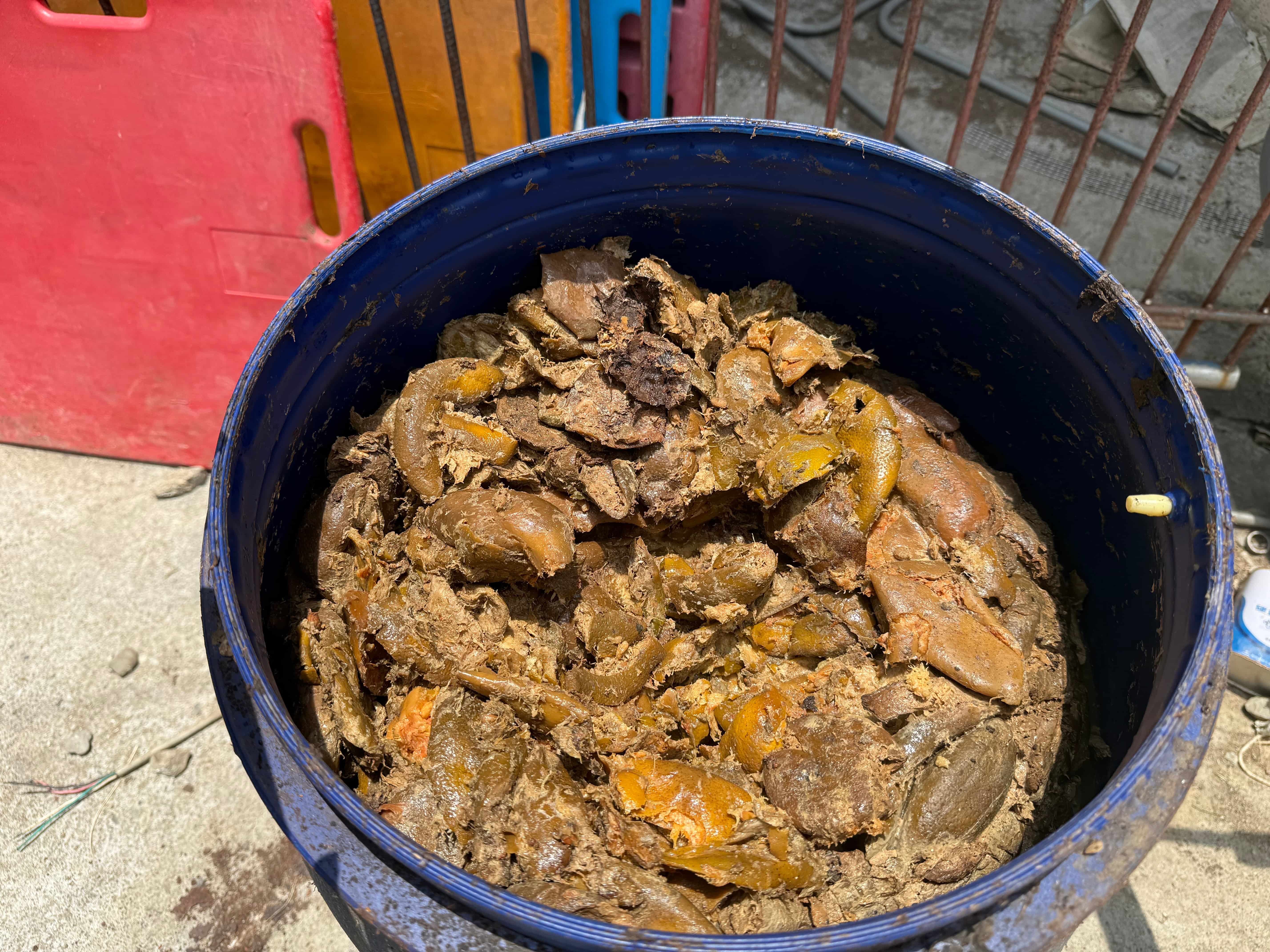 利用柳丁皮渣中富含纖維素、蛋白質、醣類及活性物質(如多酚類)之特性,將果菜截切場或果菜加工廠收集榨汁後之柳丁皮渣破碎後厭氧保存,以發酵飼料之狀態適量添加至肉豬濕式餵飼系統中進行餵養,將農副產物循環再利用,以創造不同以往之經濟價值。
