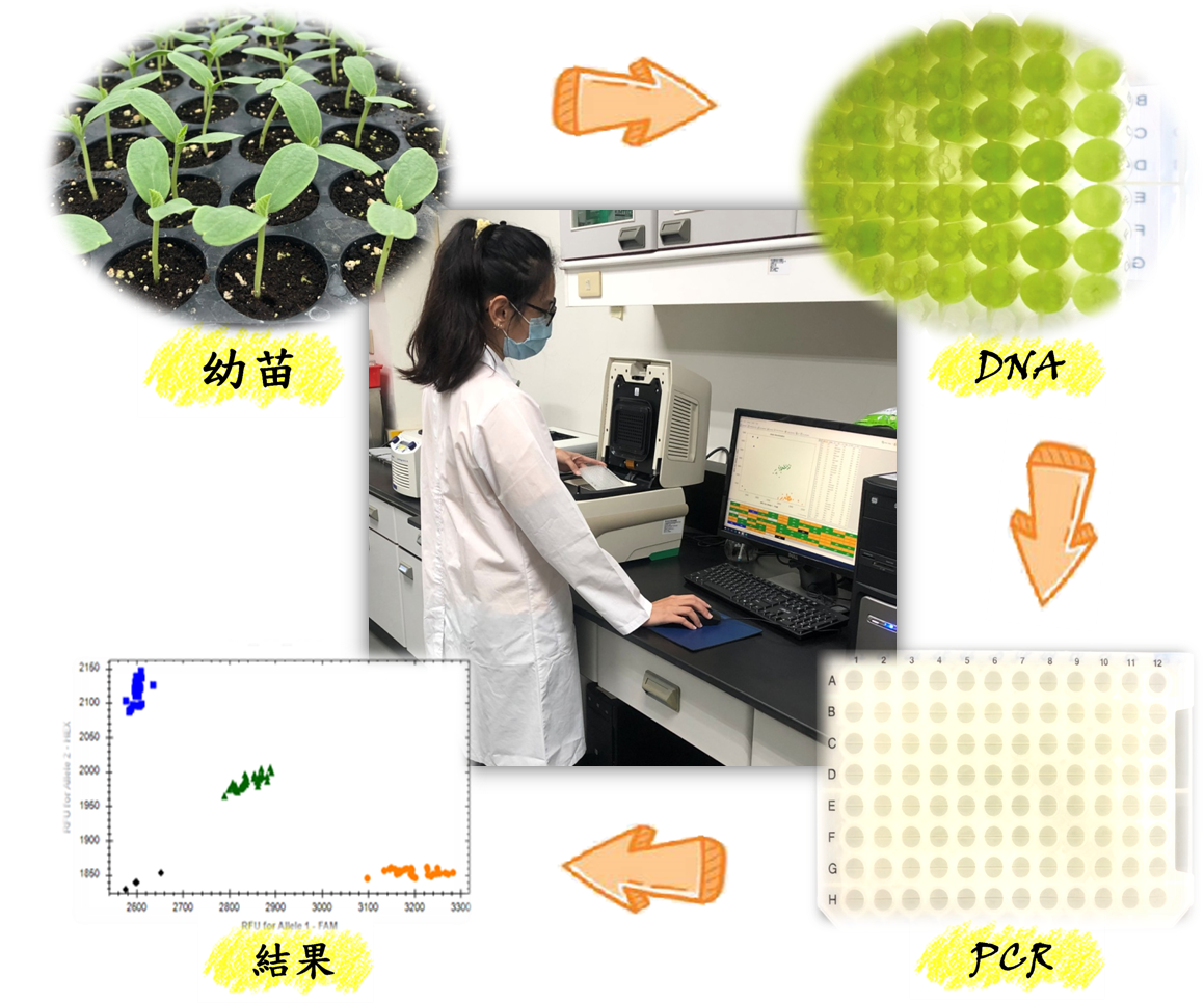 種子純度鑑定是雜交種子生產過程中品質管控的關鍵環節。本技術利用KASP(Kompetitive Allele Specific PCR)分子標誌的基因型分析平台,開發了適合運用在葫蘆科作物的雜交種子純度檢測技術。該技術具備操作門檻低、準確度高與檢測通量大等優勢,能協助種苗業者快速且有效地進行種子純度鑑定,提升出貨效率,進而確保蔬菜雜交種子的生產品質。