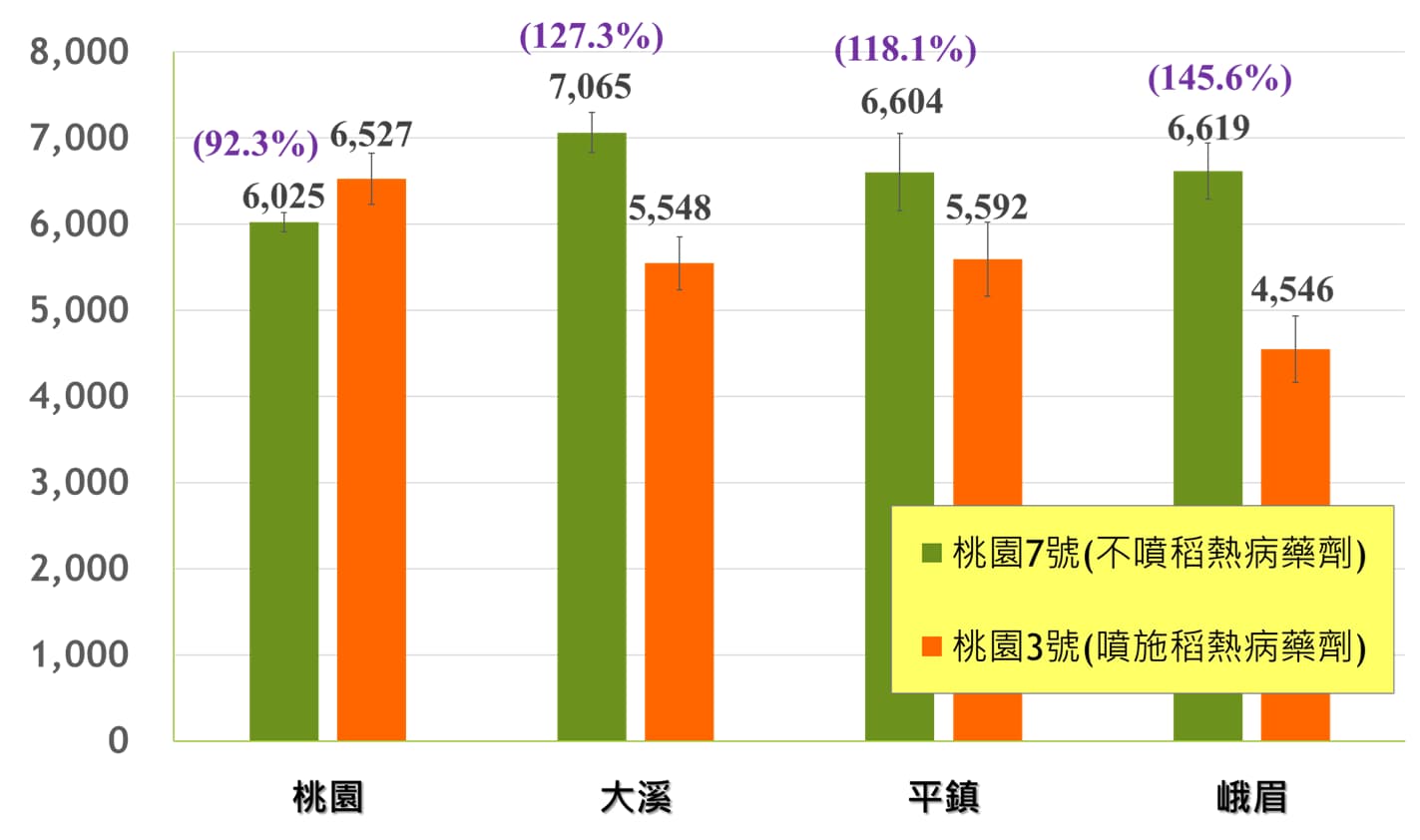 為確保水稻品種"桃園7號"的種子純潔度及高抗稻熱病特性,本場研發"水稻品種桃園7號繁殖及採種技術"。透過此技術所獲之稻種,可在生育中期減少受葉稻熱病危害,在水稻穀粒充實階段也免受穗稻熱病威脅。因此栽種此優良純度稻種之農友,可於生育全程免施稻熱病相關藥劑,並維持特殊稻米香氣,除降低成本支出外,更能提升稻作產業的韌性,減緩因氣候變遷帶來之衝擊。