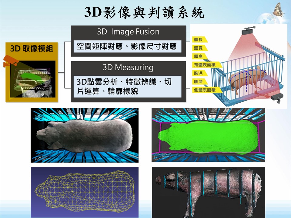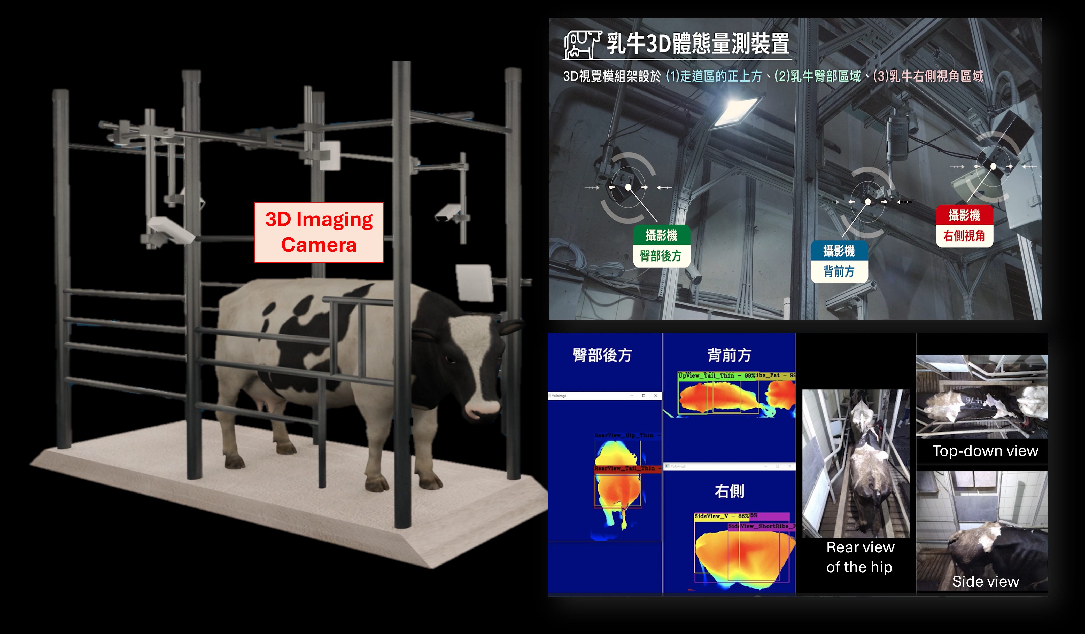本技術以3D影像與AI深度學習建構「數位影像動物體型量測及體態評分系統」,應用於乳牛與種豬。乳牛方面,結合2D與3D影像進行BCS標註,有效降低花色與髒污干擾,提升辨識準確度與穩定性,協助掌握健康與營養狀況。種豬方面,利用3D攝影機在豬隻步行15秒間量測體長、體寬、體高、胸深、腰深及體表面積等,擴大量測項目並降低人力成本與員工受傷風險,同時兼顧動物福利,提升精準育種選拔效率。整體技術整合多元數據,推動畜產智慧化發展。