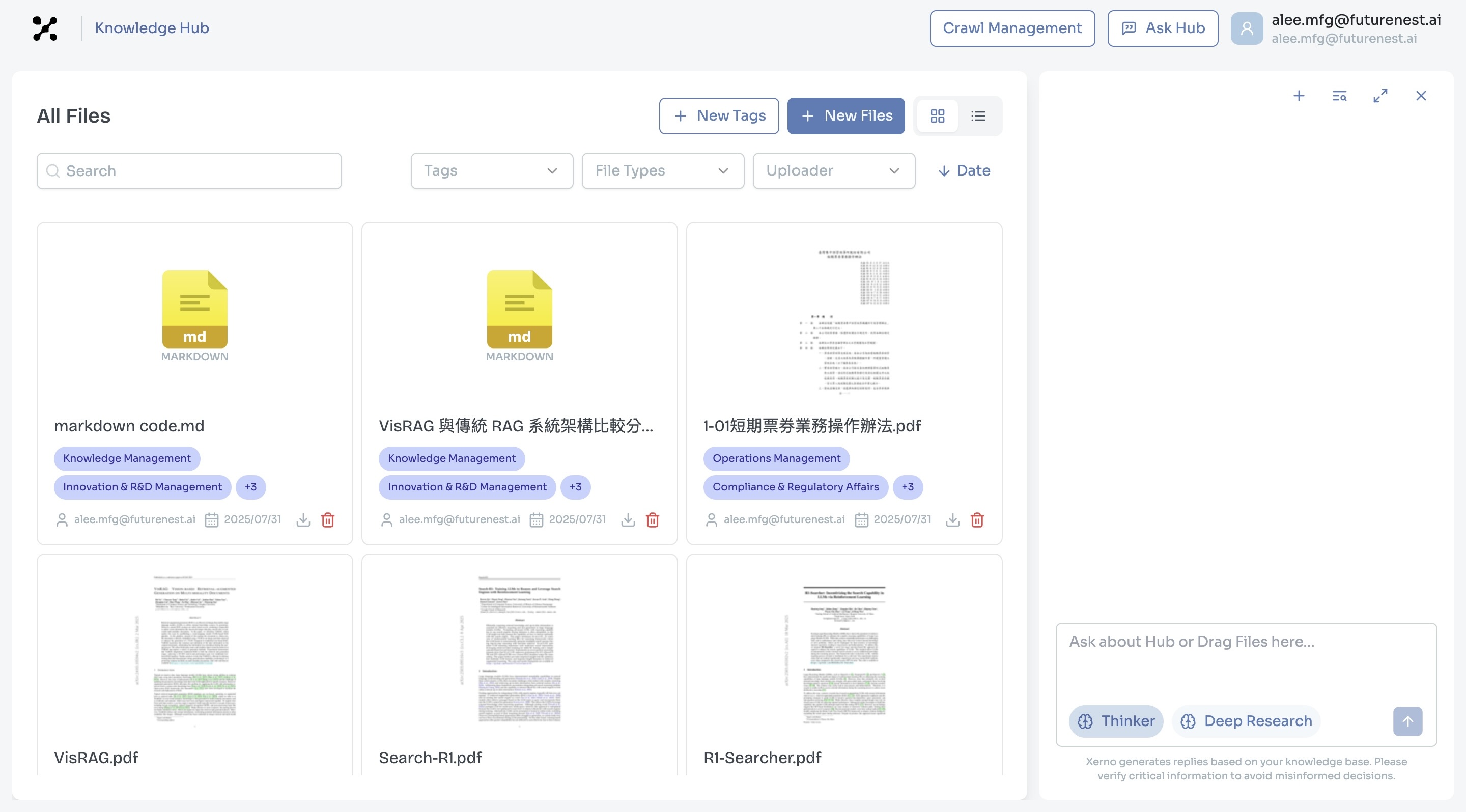 - Xerno|企業知識引擎:整合企業內外部資訊來源,轉化為可查證的知識圖譜,並支援雙重驗證與稽核追蹤,強化知識安全與治理能力。