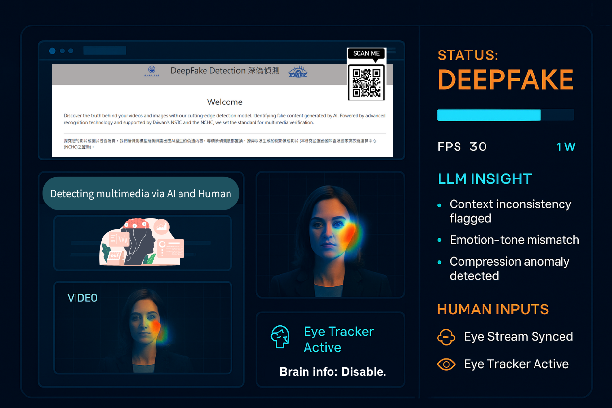 共鑑慧眼為一套新世代媒體驗證架構,首創人機雙向增益技術,解決現有AI偵測模型的瓶頸。本技術整合了能抵抗真實世界壓縮與惡意攻擊的強健AI感知模型,並突破性地將人類認知科學中量化後的隱性線索回饋AI,形成持續演化的智慧驗證系統,也是全球第一個整合AI與人腦的深偽偵測技術,提升第一線查核人員的核實能力。