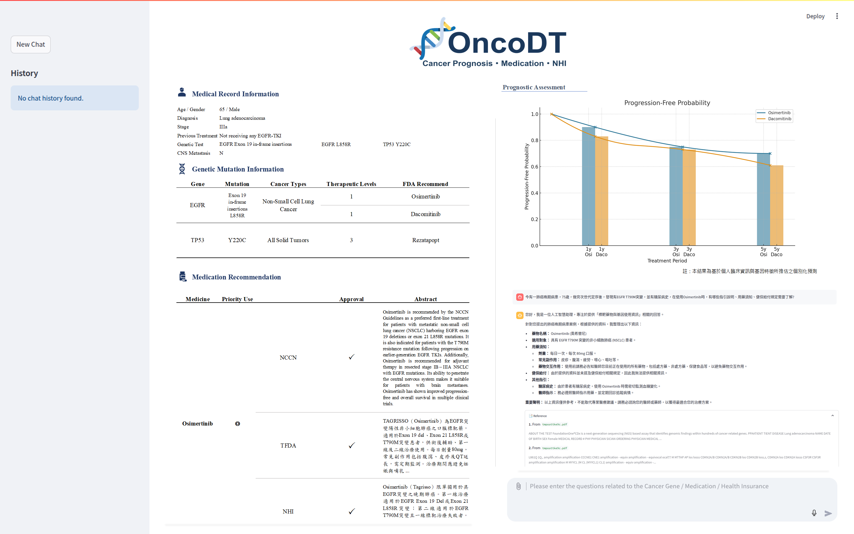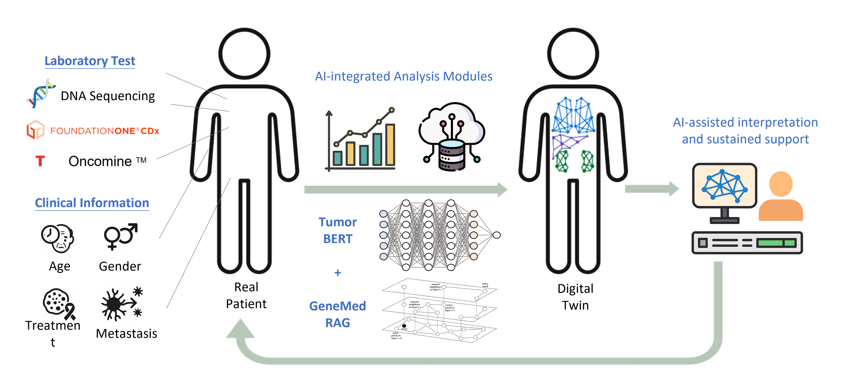 TumorBERT使用DNA序列重新編碼,透過BERT解析基因突變,結合臨床數據預測病患存活率與復發率,預測AUROC達0.72;GeneMed-RAG,採用檢索增強生成技術,能自動解析基因報告,並從含有法規指引、基因資料庫及權威期刊論文之知識庫中,即時生成精準的用藥建議,準確率高達98.3%。