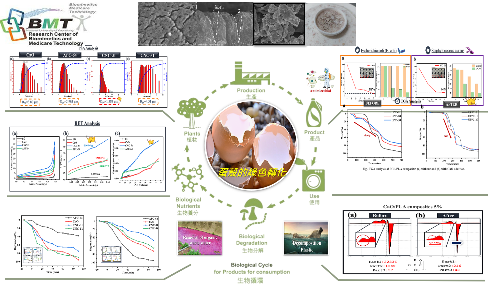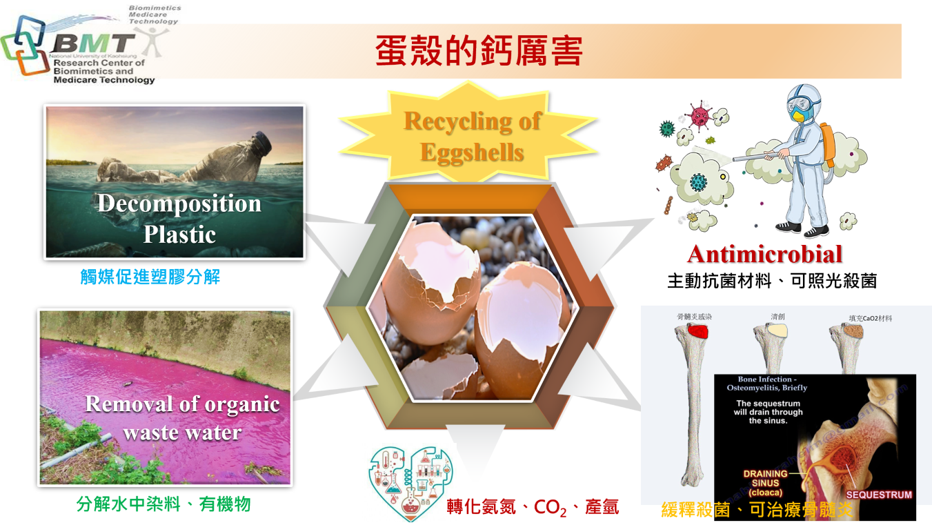 本技術係整合綠色仿生概念和技術,利用高效微波製程將表面具有微氣孔的蛋殼轉化為氧化鈣基底的多種觸媒材料,可在陽光或自然光照下分解水中有機污染物,更可被激發產生自由基,分解回收塑膠和微塑膠;也可在照光下產生電子電洞進行主動抗菌,並進一步衍生過氧化鈣緩釋殺菌材料,可做為治療目前難以處理的骨髓炎的先進醫材。