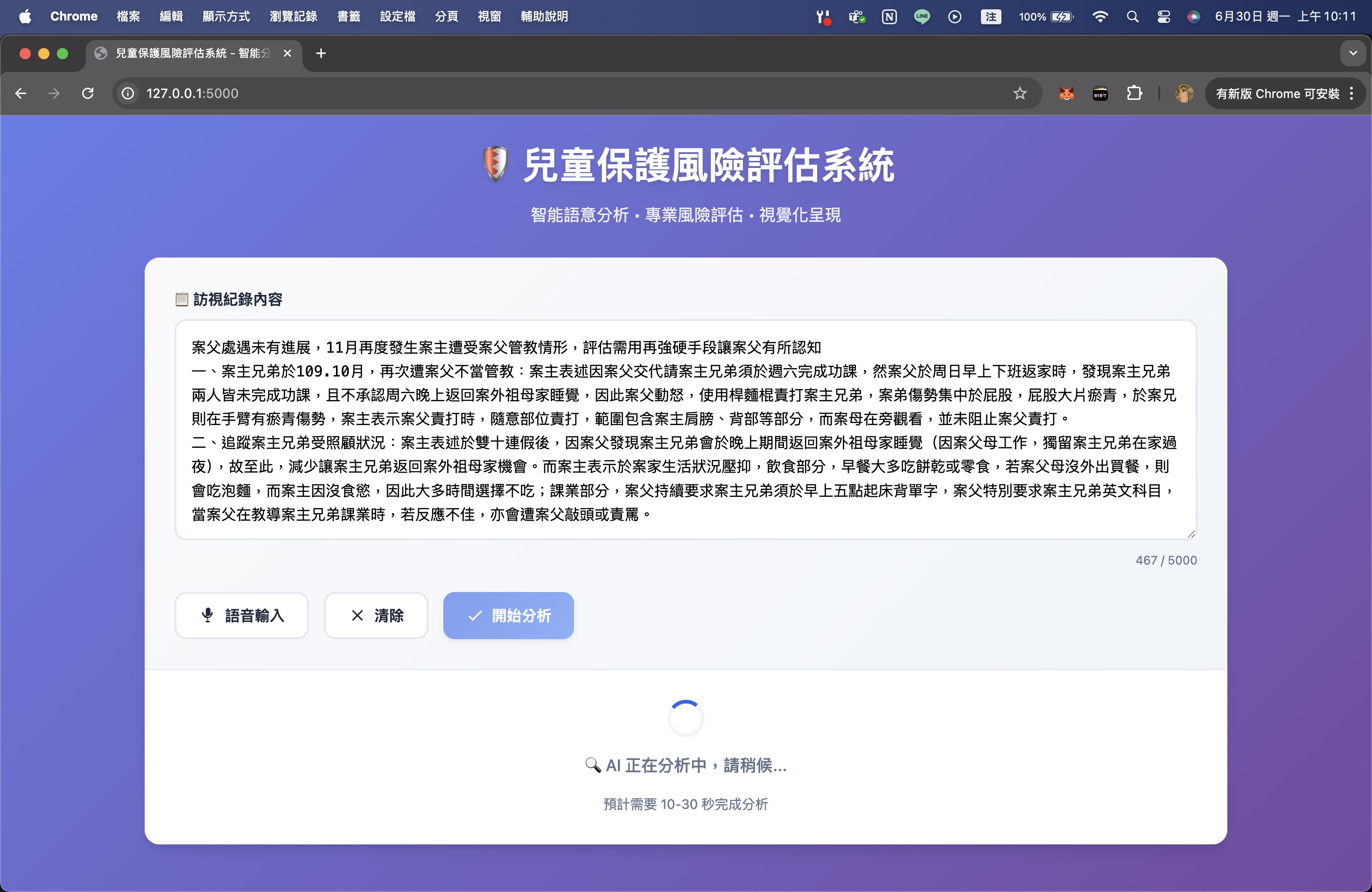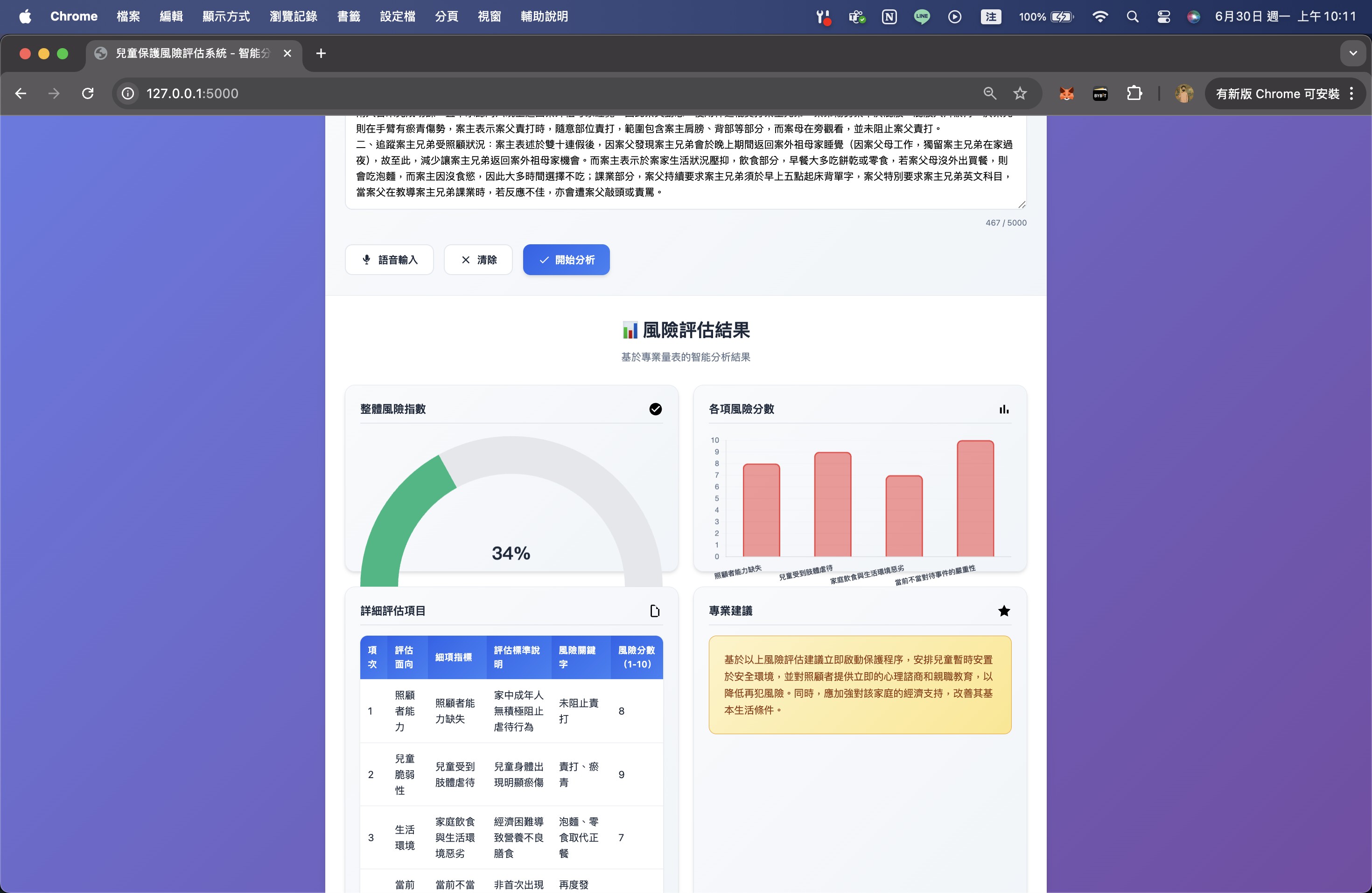 本研究整合大語言模型(LLM)與檢索增強生成(RAG)技術,分析訪視紀錄等非結構化文本,量化家庭及兒童之虐待風險,提供精準的風險評估總表與具體處遇建議,協助社工即時且有效地進行決策,提升兒童保護工作的準確性與資源調配效率。