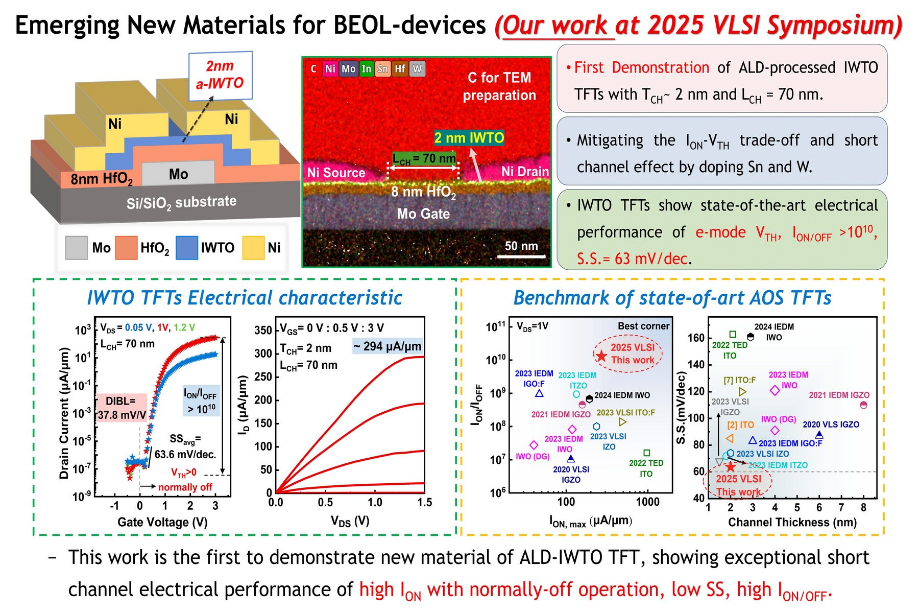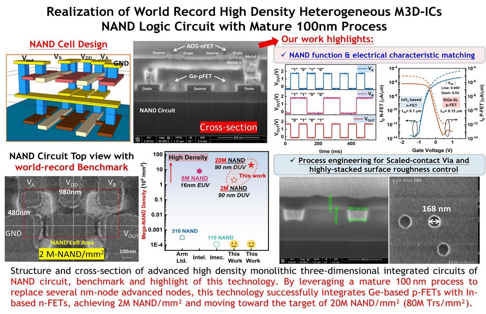 以100 奈米成熟製程取代16奈米以下先進製程,成功整合鍺基p-FET與氧化銦基n-FET之奈米級厚度通道,實現2M NAND/mm²技術,並朝向20M NAND/mm² (80M Trs/mm²)目標邁進。此外,首創高性能InWSnO電晶體,具極高開關比與低SS值,展現應用於AI與HPC晶片潛力。