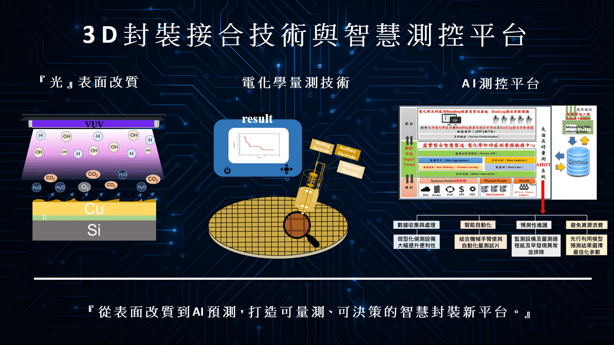 本案開發3D封裝接合技術與智慧測控平台,整合光照表面改質、微型電化學即時感測與AI預測模型,建構可即時解析Cu氧化資訊並預測Cu-Cu接合強度之智慧系統。具備可攜式、無需真空、非破壞分析與製程即時反饋等特性,能有效提升封裝良率、製程效率與穩定性,為半導體製程重大創新與突破,具高度產業化潛力。