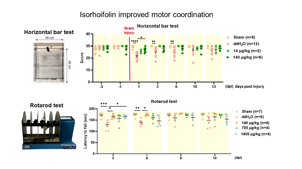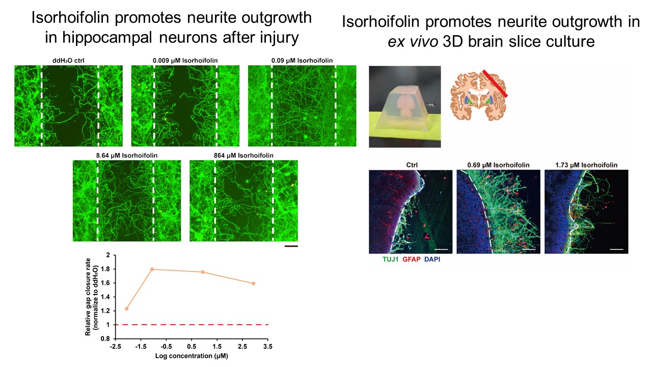 腦外傷患者日後常有腦部病變且可能發展成腦神經退化疾病。因此,在腦傷後及早使用促進腦神經再生藥物是治療的解決辦法。本發明提供證實異野漆樹苷及其衍生物可以用於促進受損腦神經元及視網膜神經的再生。本發明更發現異野漆樹苷及其衍生物能穿透血腦屏障,並有效的促進行動功能回復。