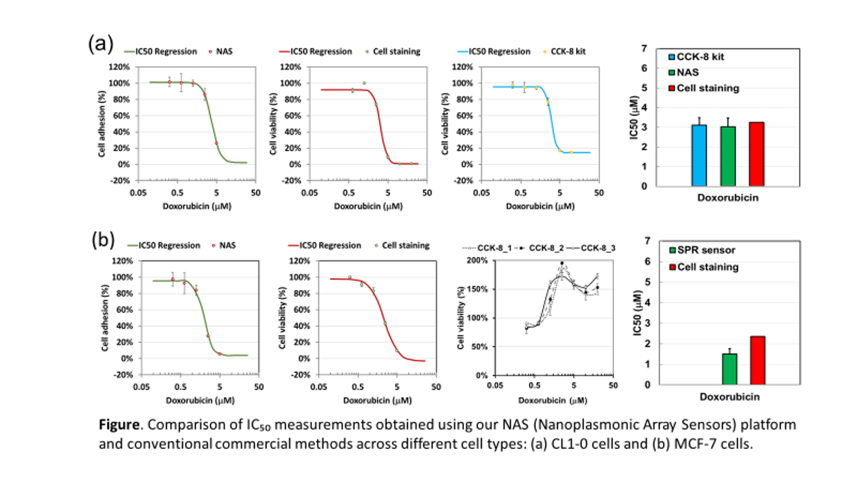 藥物毒性半數抑制濃度為量化藥物效力的重要藥理參數。我們發展一種不需要標定的對比式表面電漿共振成像技術評估藥物對細胞產生的毒性。與傳統的細胞增殖數量檢測套組與細胞活性螢光染色法相比,成像檢測平台所得到的數值結果高度一致。可準確用來量測黏附細胞型細胞之IC₅₀,且達到高通量及無須標記的特性。