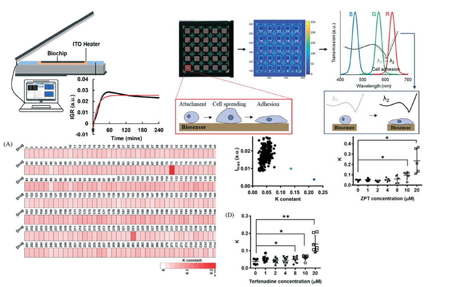 一種結合專利奈米電漿子晶片與影像對比技術的新型表面電漿共振檢測平台,具備免標定、高靈敏度、低成本優勢。此技術可廣泛應用於生醫領域,特別是藥物開發中常用的濃度測定,提供高通量且精確的藥物效力評估,對藥物篩選具高度市場價值。此平台也適用於進行分子交互作用分析、污染物監測與食品安全檢測等。