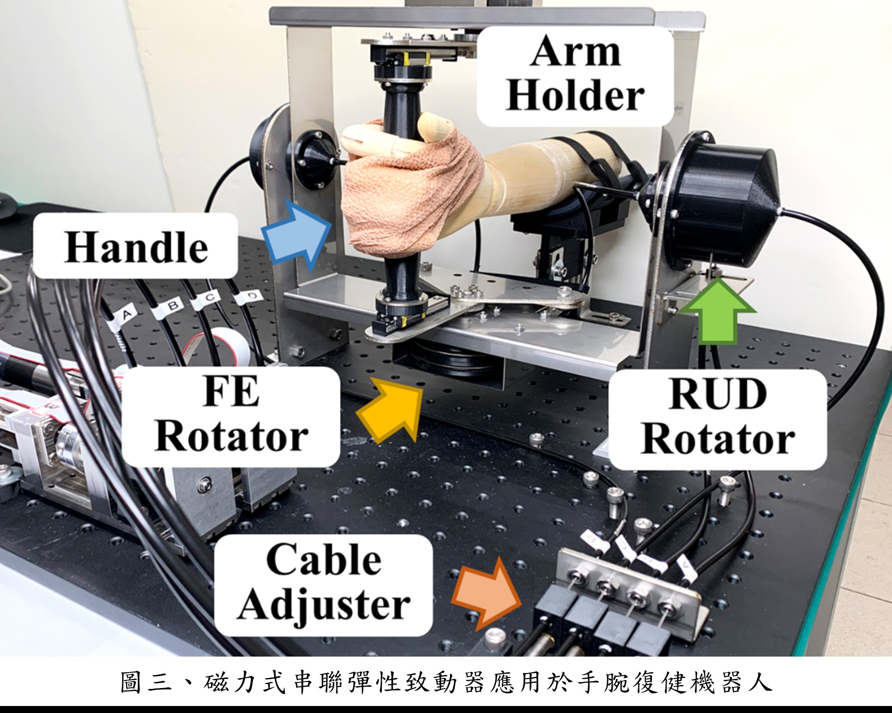 本技術旨在開發智慧型手腕復健機器人,以因應高齡化與手腕疾病增加的挑戰。系統結合磁力式串聯彈性致動器,具備無接觸式力量傳遞與可調變剛性提升安全性。設計上採取自對準機構與線驅動概念,適應不同使用者並控制兩自由度運動。裝置亦可透過扭矩與角度資訊量化關節剛性,搭配多種復健策略支援中風復原階段,提升復健成效。