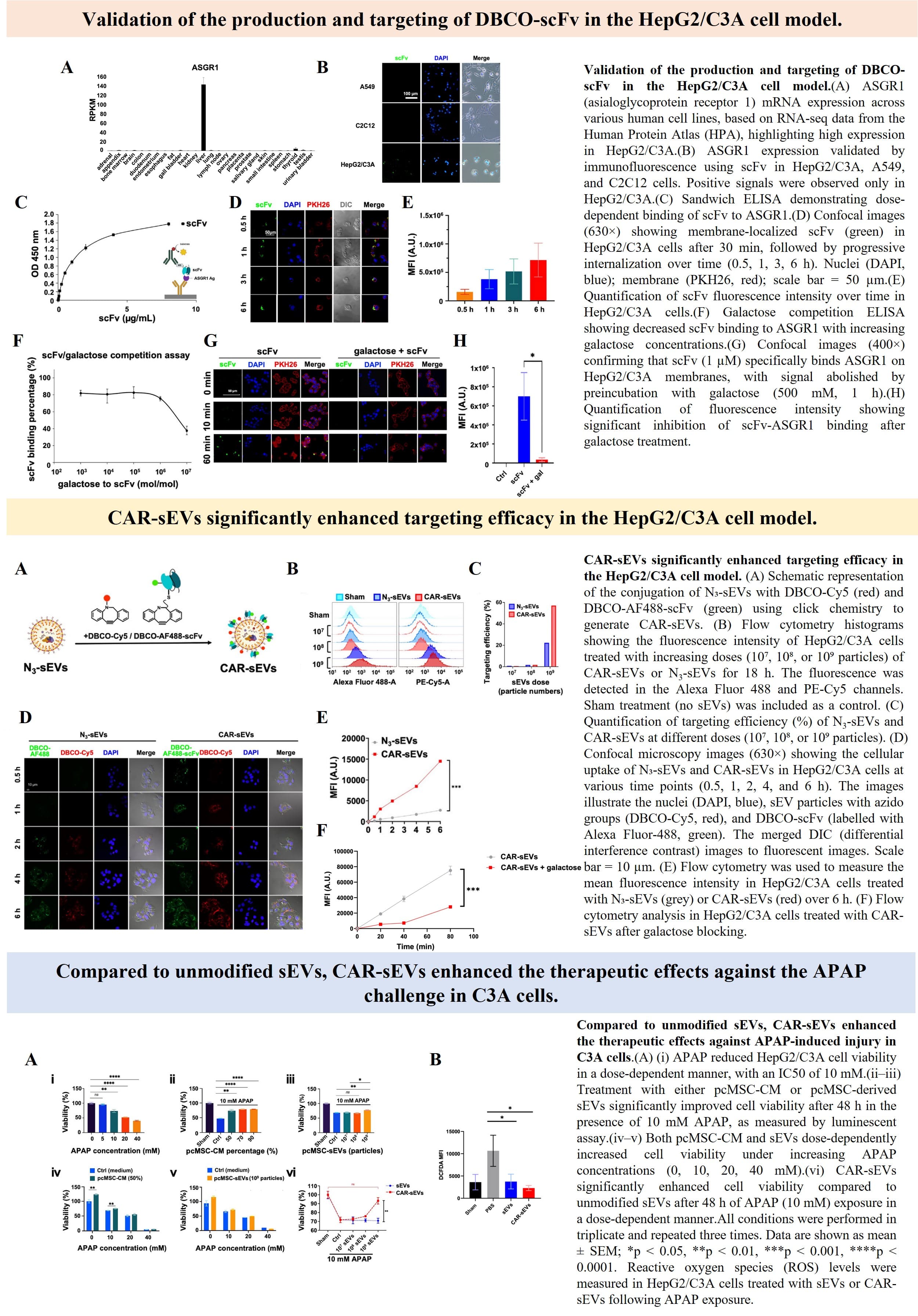 研究整合: 代謝性糖類工程於無血清培養之MSCs,使MSCs衍生EV表面呈現azide基團,並透過click chemistry結合DBCO修飾分子,針對肝臟受體ASGR1的設計單鏈抗體片段,結合DBCO進行修飾,建立高品質、精準、低成本的非基因改造EV靶向修飾平臺,以提升外泌體靶向能力與治療效率。