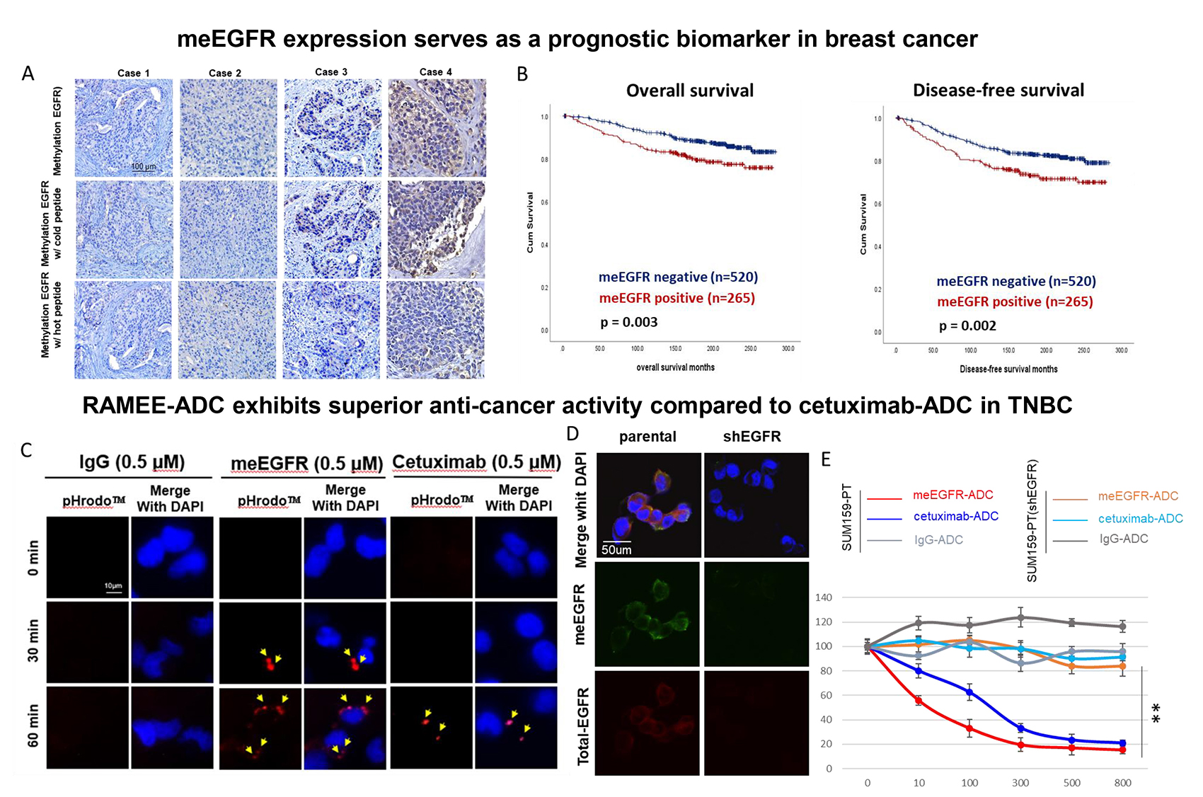 本研究團隊致力開發針對上皮細胞生長因子受體(EGFR)甲基化修飾的創新癌症標靶治療。酪胺酸激酶EGFR胞外結構域上兩個精胺酸的甲基化,可增強其與配體的結合力,並促進致癌訊號傳導。我們研發的藥物抗體複合體(ADC)可專一性辨識並攻擊這類甲基化EGFR,預期成為三陰性乳癌及其他實體腫瘤的首創性治療策略。