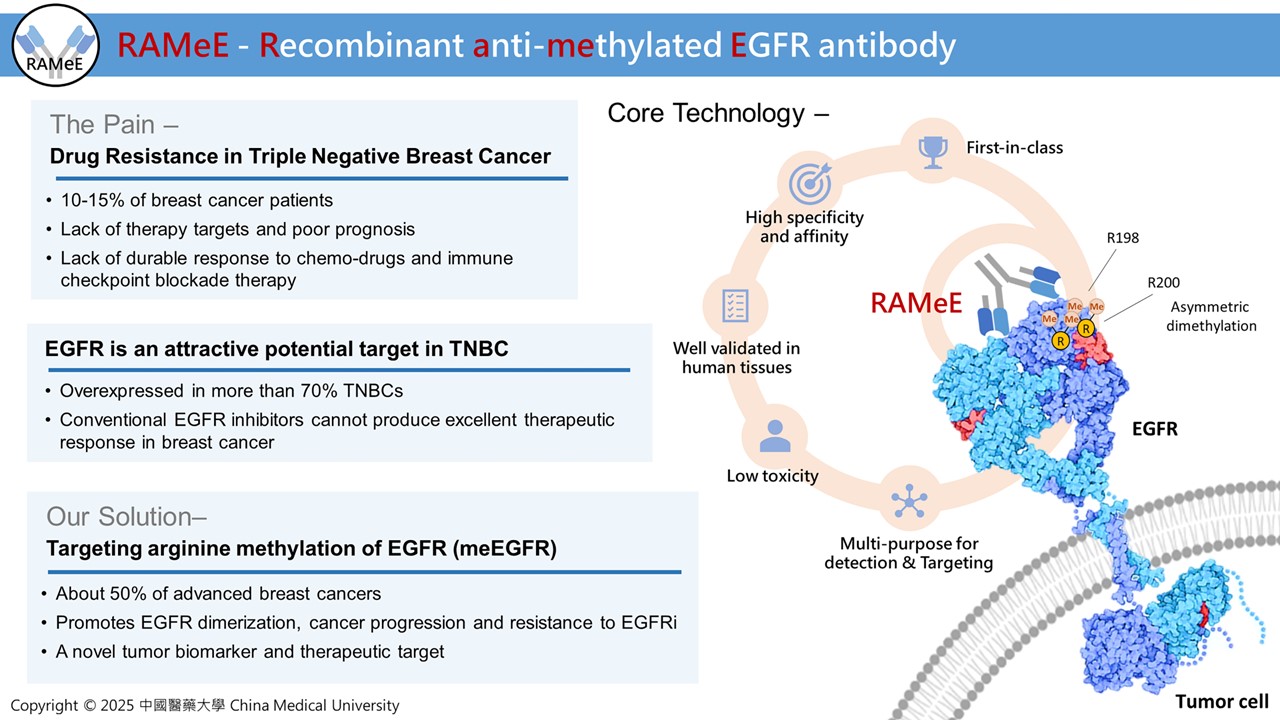RAMeE平台專一識別EGFR甲基化修飾(meEGFR),臨床樣本驗證其卓越預後與預測價值。憑藉抗體藥物偶聯物(ADC)、CAR-NK、以及未來CAR-T細胞療法的創新開發,展現強大商品化潛力,具備推動first-in-class新藥問世及引領精準癌症免疫治療革命的關鍵優勢。