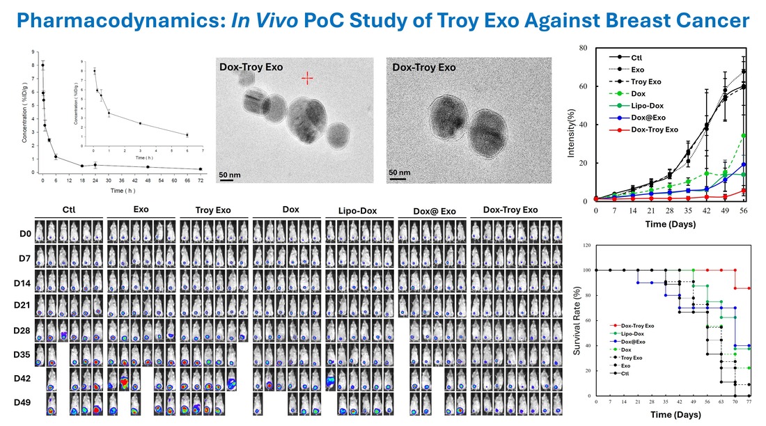 Troy Exo為基因工程化靶向外泌體平台,具天然生物相容性、低毒性、低免疫原性及高體內穩定性,克服人工奈米載體的免疫風險與靶向侷限。其可精準導向腫瘤與免疫抑制,可承載多種藥物與核酸,實現多模態治療。平台具GMP量產能力,支持臨床開發,並擁有完整智財佈局,具高度成藥性、差異化優勢與多適應症拓展潛力。