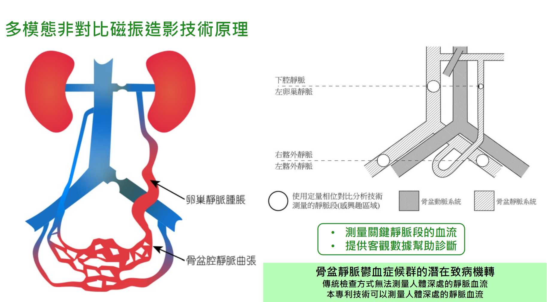 本技術為首套應用於骨盆靜脈鬱血之多模態非對比MRI診斷模組,整合3D血管影像與2D血流分析,量化異常回流並提供影像與數值化報告,輔助診斷與治療規劃。已臨床應用逾800例,完成跨院技術驗證,成果刊登於國際頂尖期刊IJS(JCI第2),榮獲2024國家新創獎,並取得台美發明專利,具臨床可行性與商業潛力。