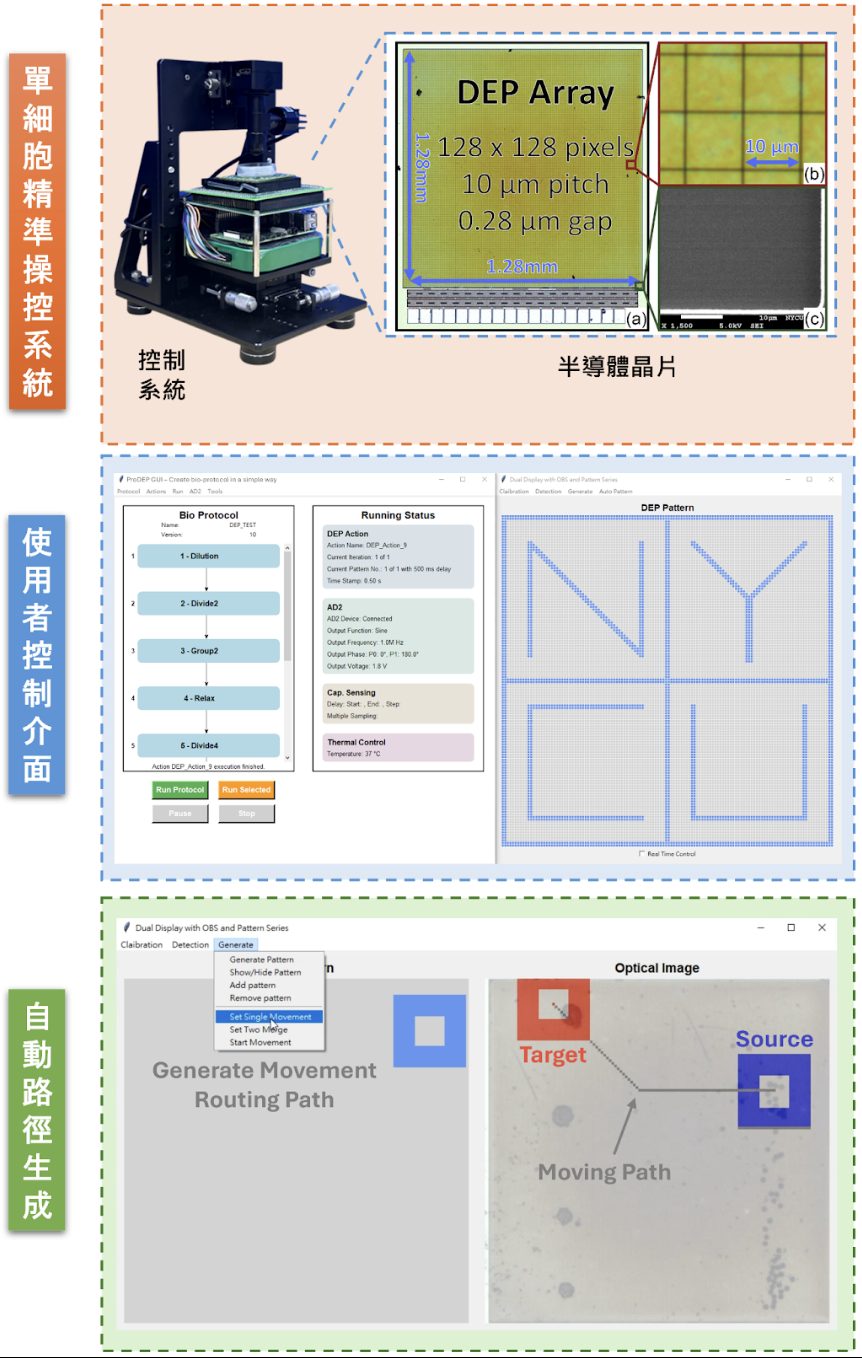 ProDEP 為全球首創將台灣半導體標準製程技術導入智慧醫療的「單細胞」精準操控平台,結合 CMOS 電極陣列與 AI 操控系統,突破傳統難以標準化與自動化瓶頸,實現高精準、無標記、非接觸的精準細胞分類與自動搬運。系統已佈局台美日專利申請並發表多篇IEEE論文,為智慧醫材創新提供具體落地的核心平台。