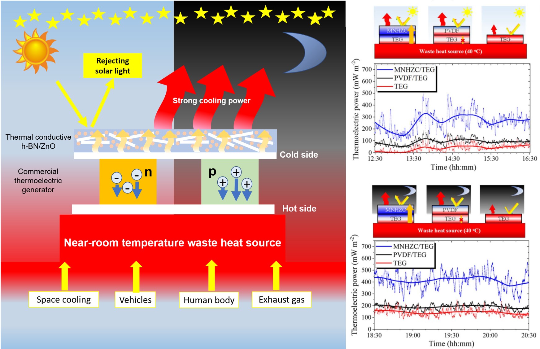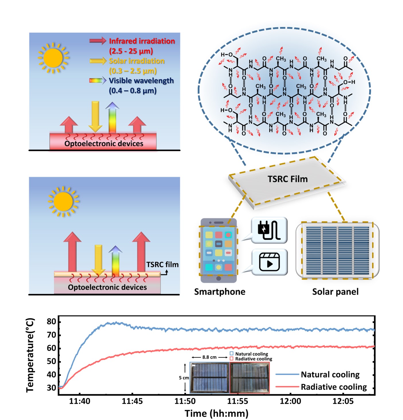 本團隊透過先進光學工程,設計尖端日間輻射冷卻材料-於太陽光譜區具有極低吸收率,避免吸收太陽供給的輻射熱能;並同時於中紅外光大氣窗口波段具有高放射率,可將熱量穿過大氣層輻射傳送至極低溫的外太空(-270度)。此技術不僅有利於建築物、交通工具與電子元件之全天候零耗能熱管理,亦有助於發展低溫廢熱回收技術。