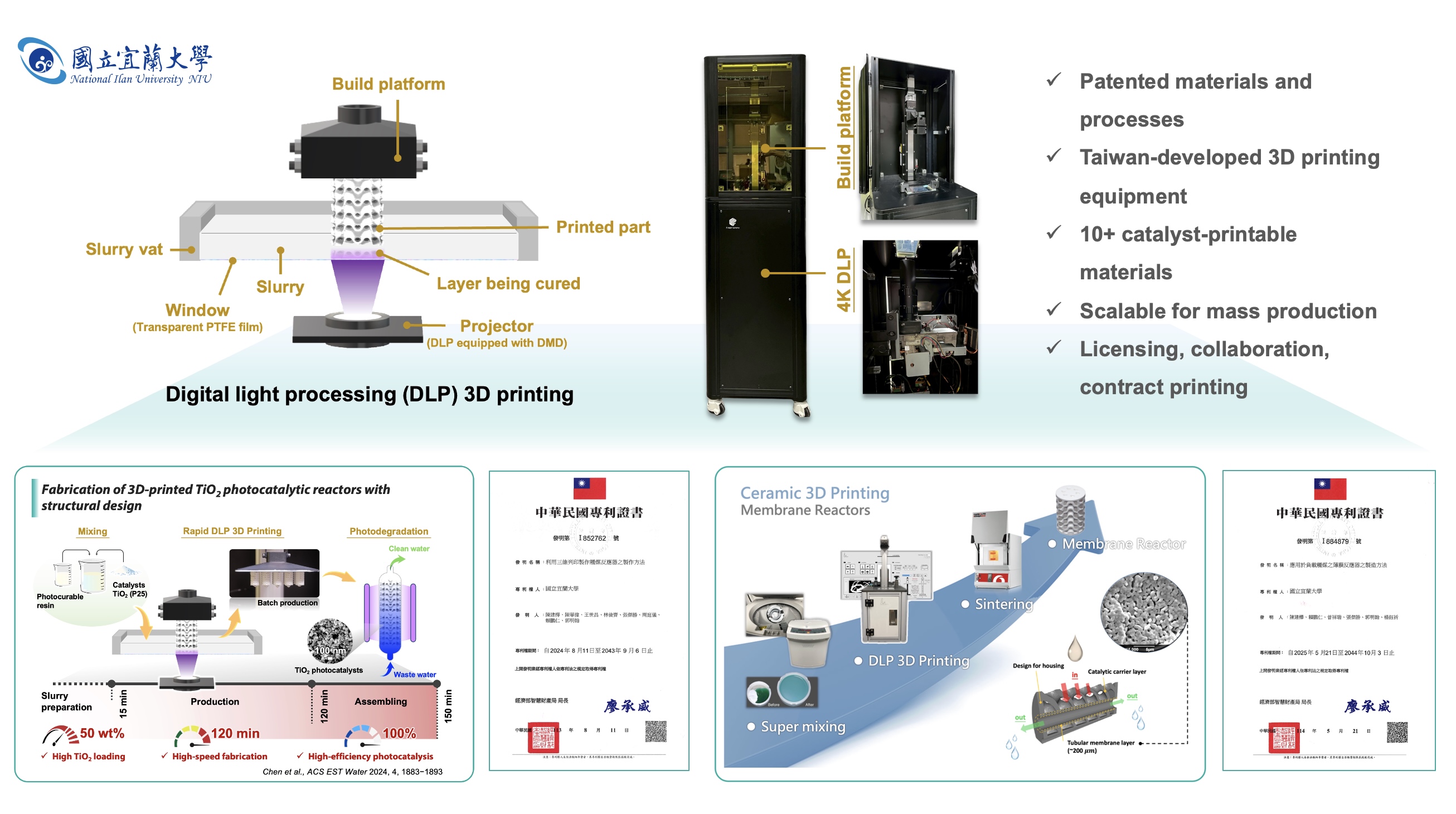本技術建構可規模化之觸媒3D列印製程,開發高觸媒含量列印漿料,結合拓樸結構、DLP列印與後處理技術製造高效反應床。已完成TiO₂、Zeolites、MOFs、金屬與陶瓷等材料驗證,涵蓋氫能、污染降解與VOCs吸附催化等淨零應用。技術導入AI與數位製造,已取得兩項發明專利,實現智慧反應器模組開發與應用落地。
