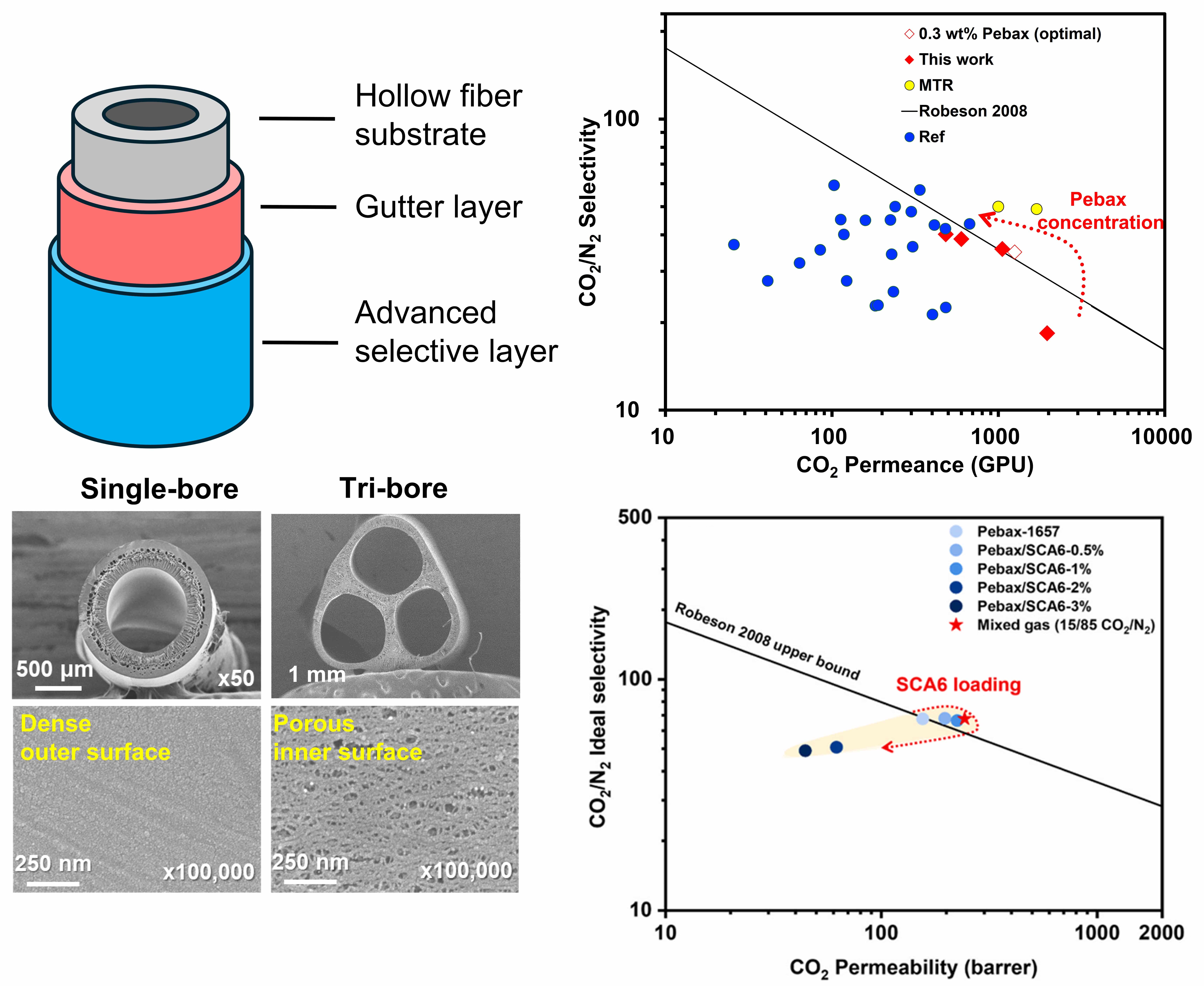 本團隊專注開發複合中空纖維聚合物薄膜,透過系統性優化紡絲條件,調控薄膜內外部結構,提升基礎氣體滲透性。運用潤濕液與塗佈液不互溶特性,實現連續式潤濕與塗佈製程。並以電漿技術強化中間層與選擇層間之界面親和性。本團隊亦致力開發選擇層新穎材料,成功克服滲透性與選擇性的權衡限制,展現於二氧化碳捕捉領域的潛力。