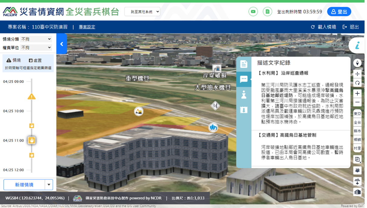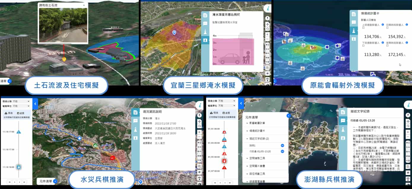 全災害兵棋台結合數位孿生、三維視覺化與跨域資料整合,打造複合式災害時序模擬演練平台。系統支援颱風、豪雨、淹水、土石流、地震、輻射與化學災害等多種情境,能即時計算影響範圍,推估人口暴露、醫療量能、避難收容與基礎設施受災狀況,並模擬交通中斷與能源損失。平台採模組化元件設計,搭配角色分工協作及即時資料整合,突破傳統紙本與靜態演練限制,大幅提升跨部門協調效率與防災決策韌性。