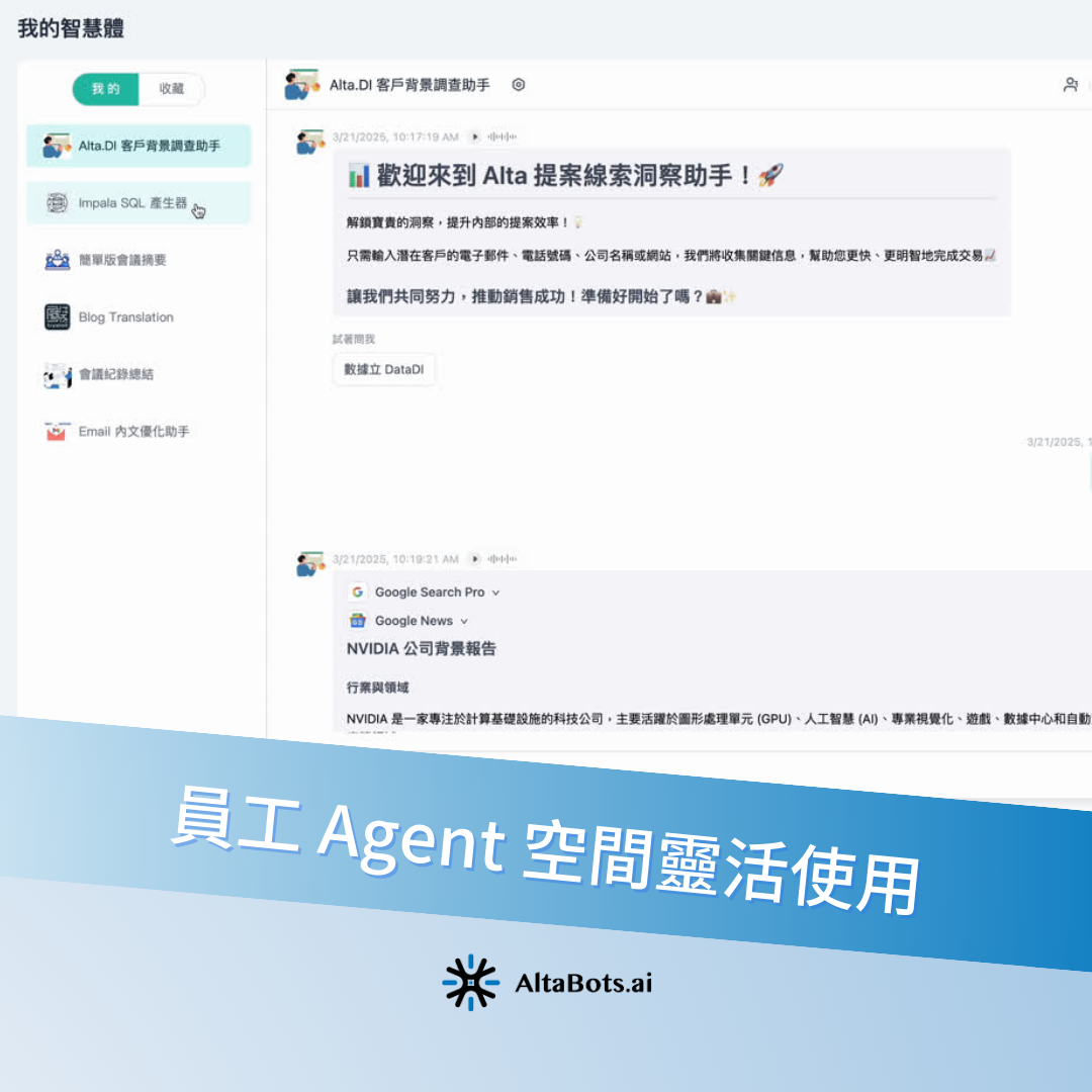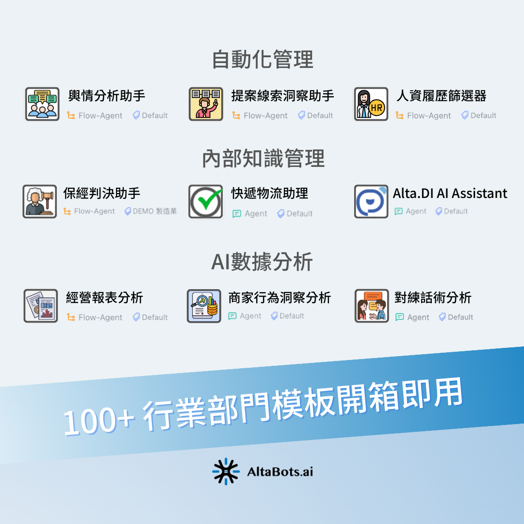 AltaBots.ai 是一個無程式碼的 AI Agent 開發平台,讓業務人員能輕鬆建立 AI 應用。平台提供超過 100 個 AI 模板與小工具,涵蓋客服、行銷等多元場景。它支援所有主流大型語言模型(LLM)串接,並提供專屬的企業級 AI Workspace,讓 AI 直接為業務服務。AltaBots.ai 的三大特點是:高度靈活、無需程式碼、快速部署。